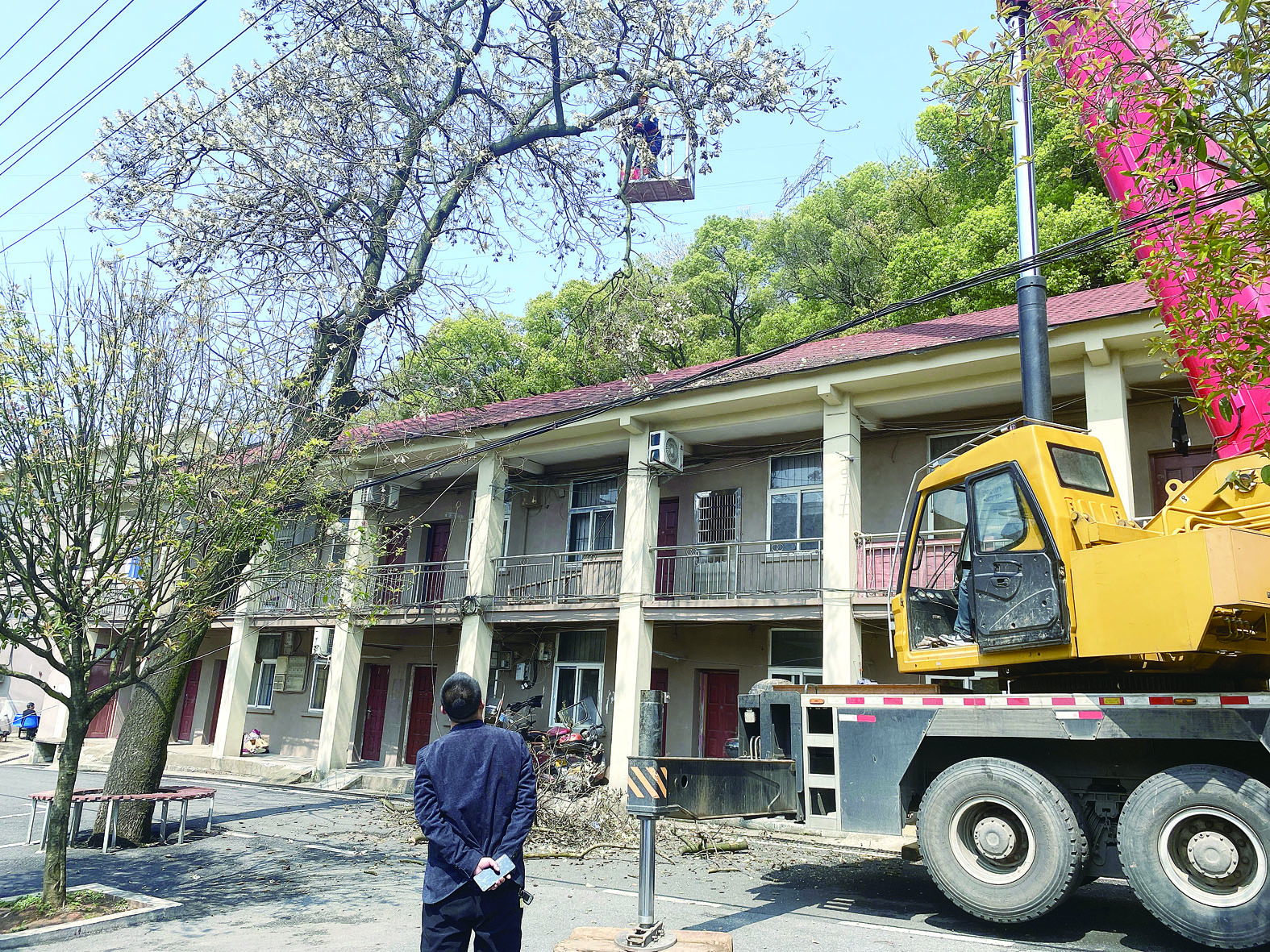 石峰区响石岭街道石峰头社区海利新小区一棵大樟树已枯死,并有向房屋倾倒现象,存在安全隐患。近日,石峰头社区联合相关部门,请来专业砍伐队对枯树进行砍伐。在城管工作人员、楼栋长、志愿者、热心居民等多方努力下,枯枝也清理得干干净净,成功消除小区隐患。石峰头社区党委书记、网格长冯艳说,社区还会继续以居民的诉求为出发点,做好事、办实事,营造一个安全、干净、宜居的社区环境。株洲晚报融媒体记者/杨如 通讯员/王雨龙 摄影报道