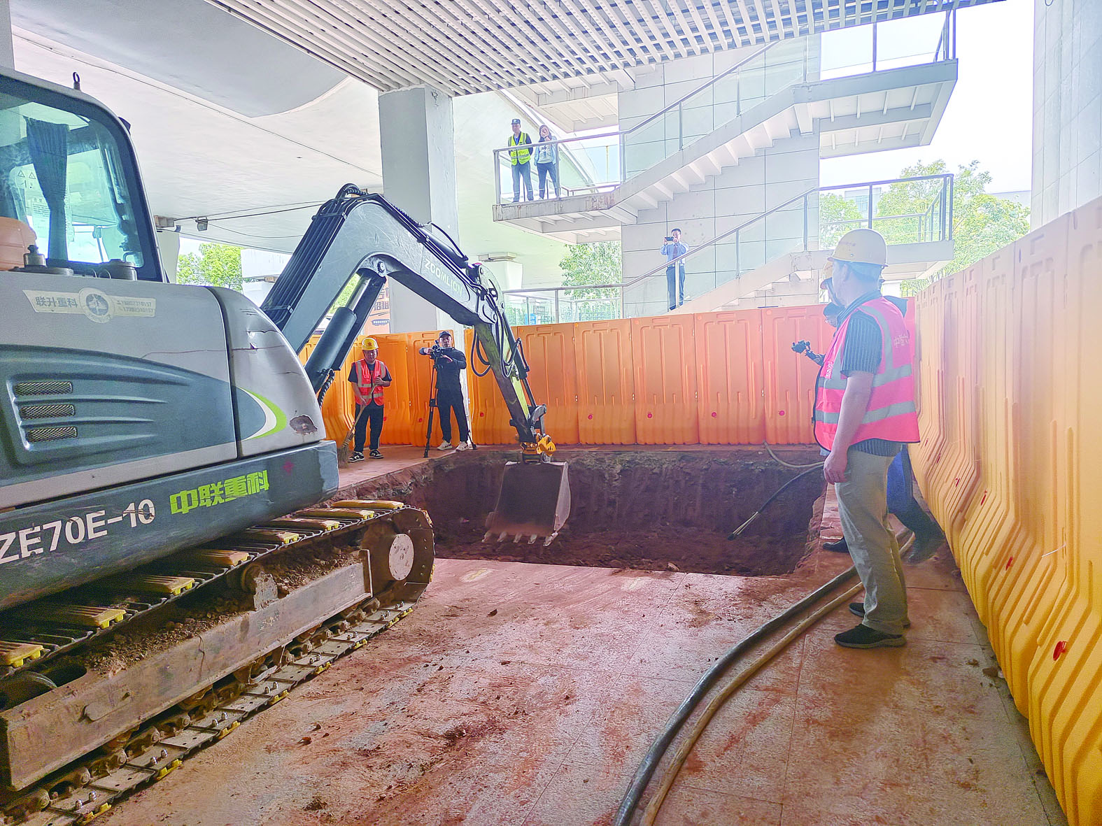 站外垂直电梯施工现场,基坑已开挖至半米深。 记者廖明/摄