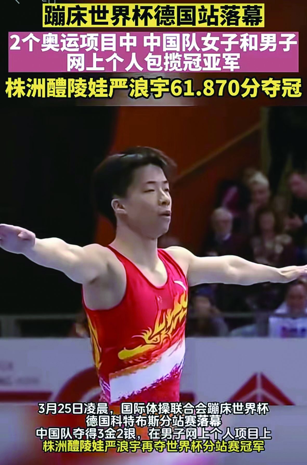 在3月25日凌晨落幕的国际体联蹦床世界杯科特布斯站比赛中,中国蹦床队表现出色,夺得3金2银。在男子网上个人项目中,株洲醴陵娃严浪宇再夺世界杯分站赛冠军。