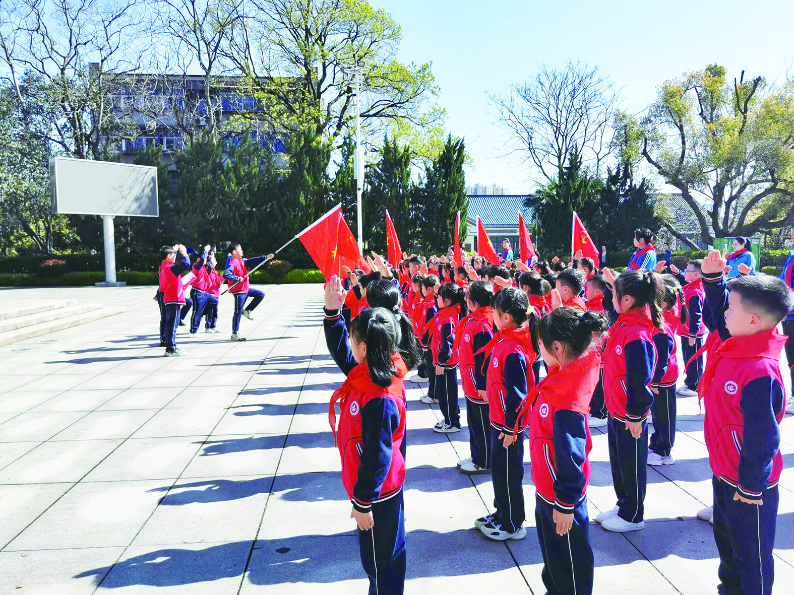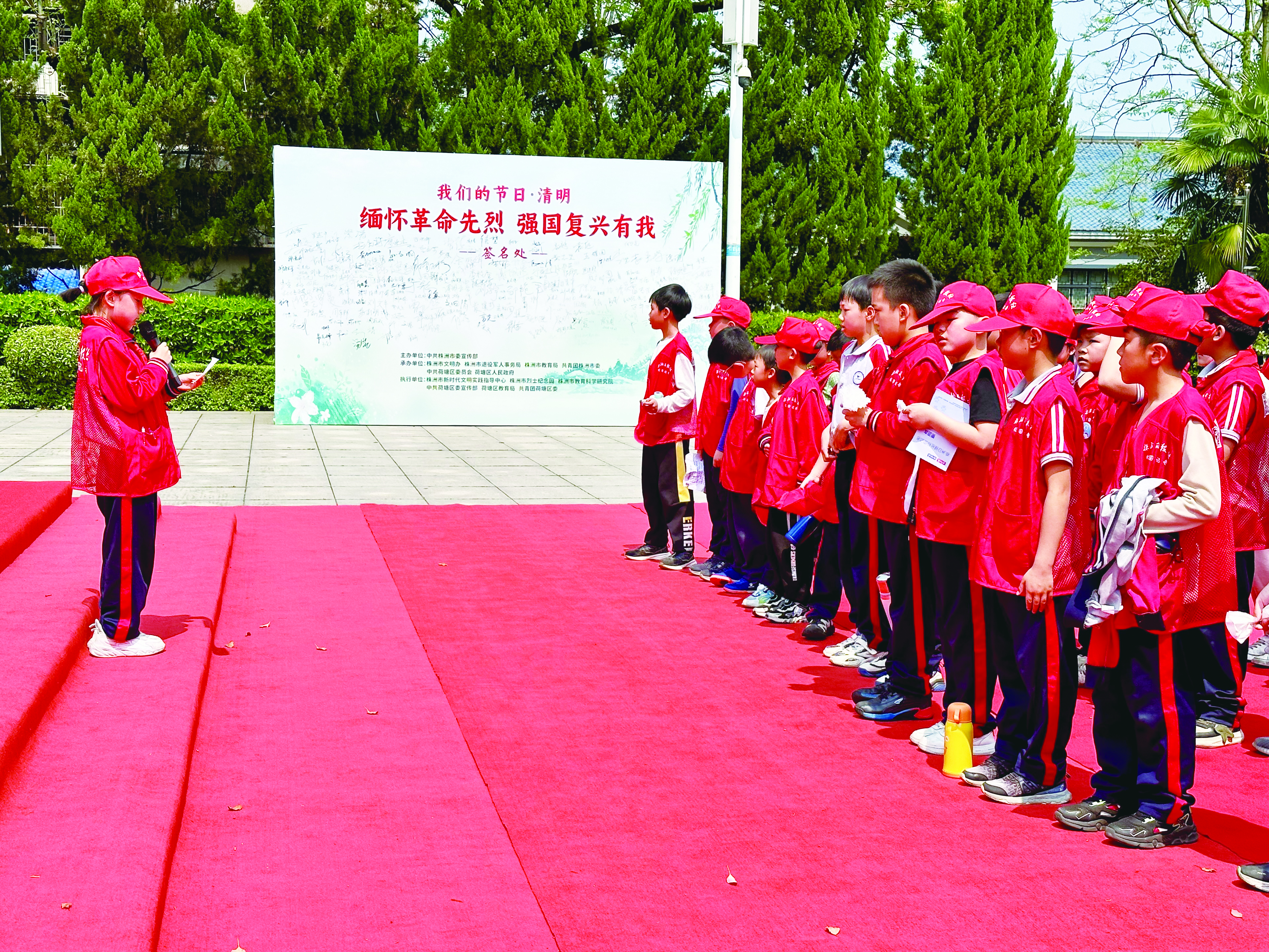 3月29日,市二中青龙湾小学百余名师生代表在株洲烈士纪念园迎队旗、唱队歌,举行一年级首批入队仪式。从这天起,该校2024上学期首批入队的90名一年级学生加入中国少年先锋队组织,戴上鲜艳的红领巾,成为光荣的少先队员。