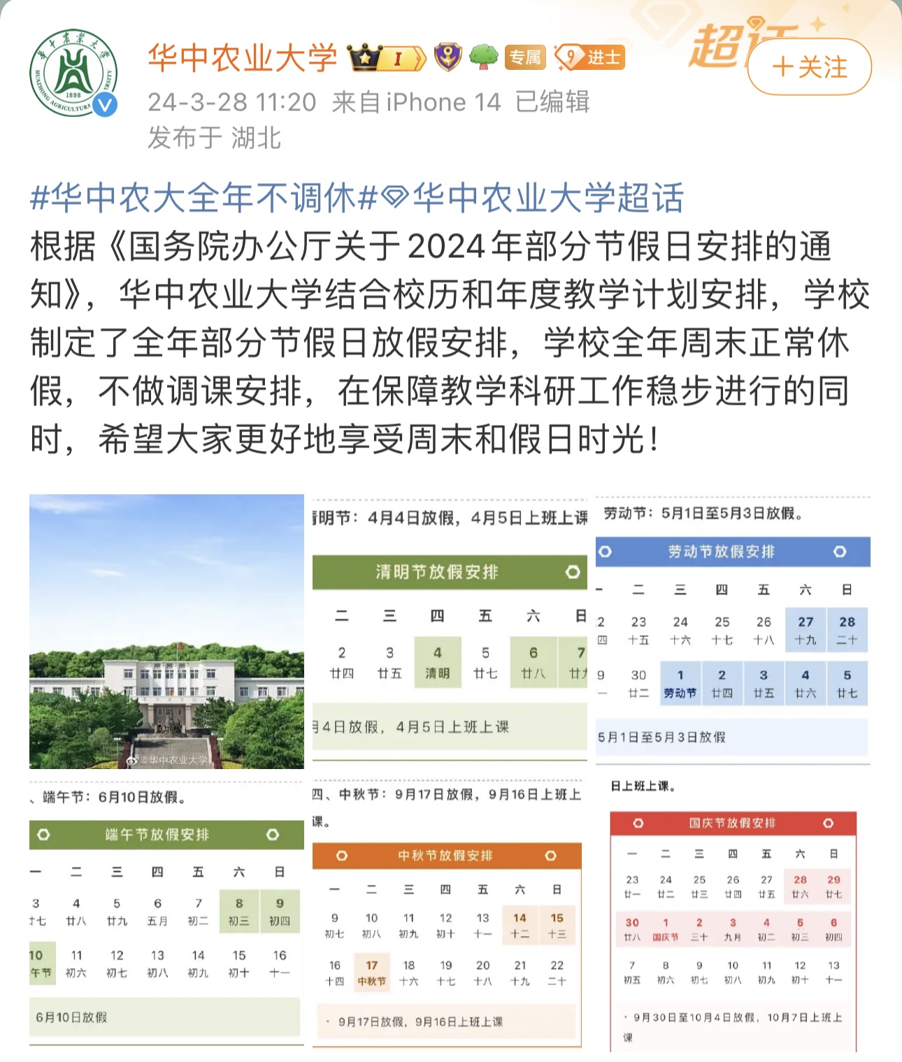 华中农大全年节假日都不调休