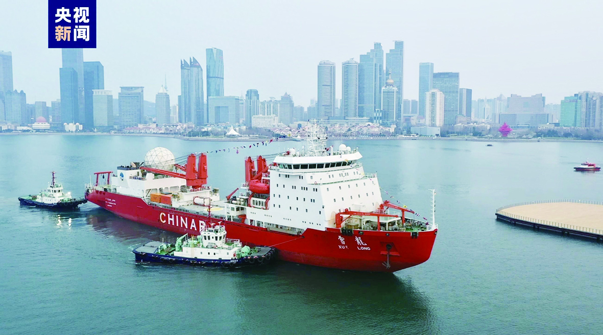 昨日,由自然资源部组织的中国第40次南极考察队圆满完成考察任务,全部返回国内。考察队于去年11月1日从国内启程,共历时5个多月,圆满完成建设南极秦岭站等各项考察任务。图为4月10日6时26分,“雪龙”号极地考察船停靠山东青岛。 (据央视新闻)