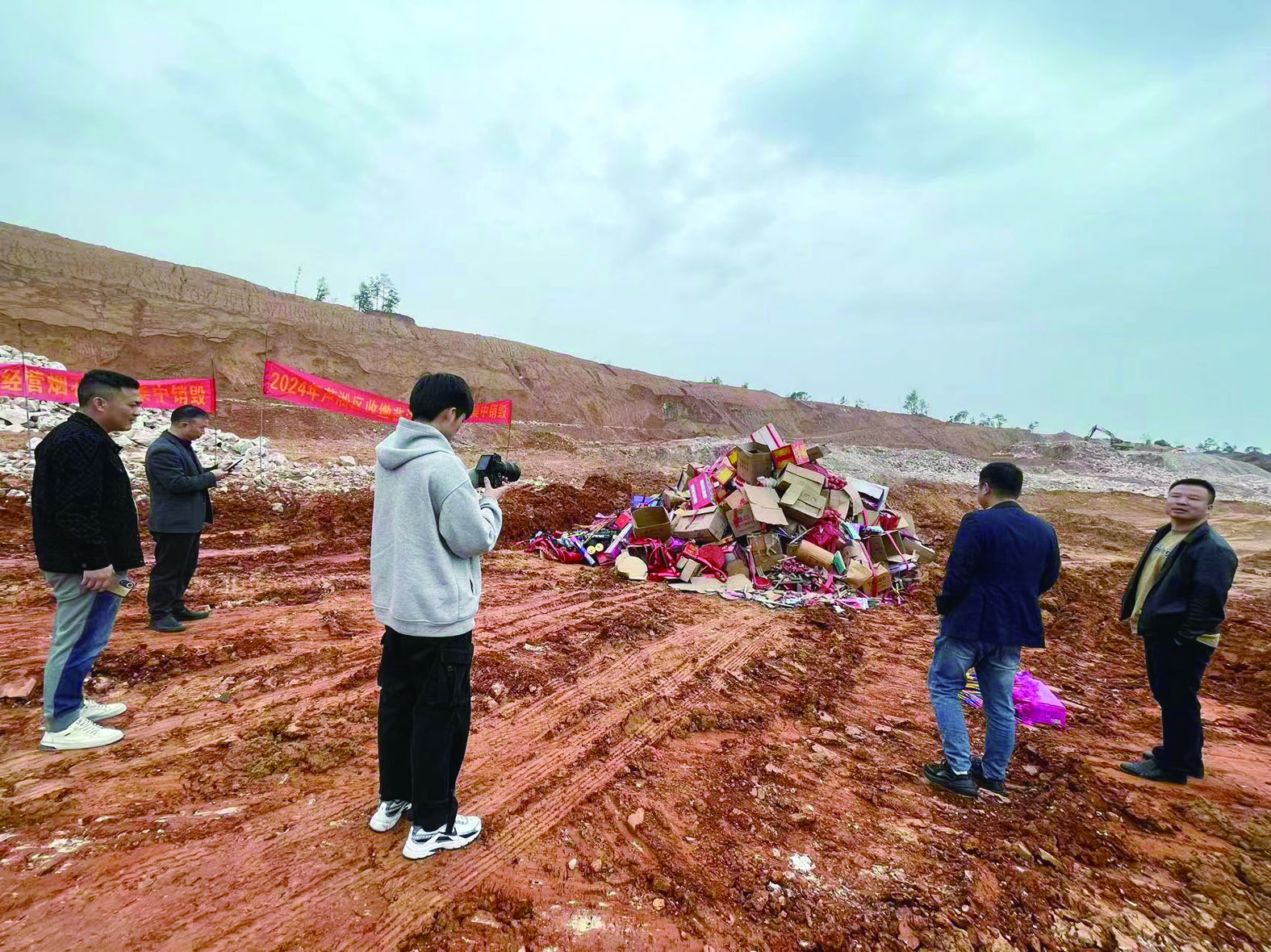 “开始销毁!”4月9日,在芦淞区董家塅街道一处山头,随着现场指挥员一声令下,专业技术人员立即点燃近2977箱假冒伪劣烟花爆竹。