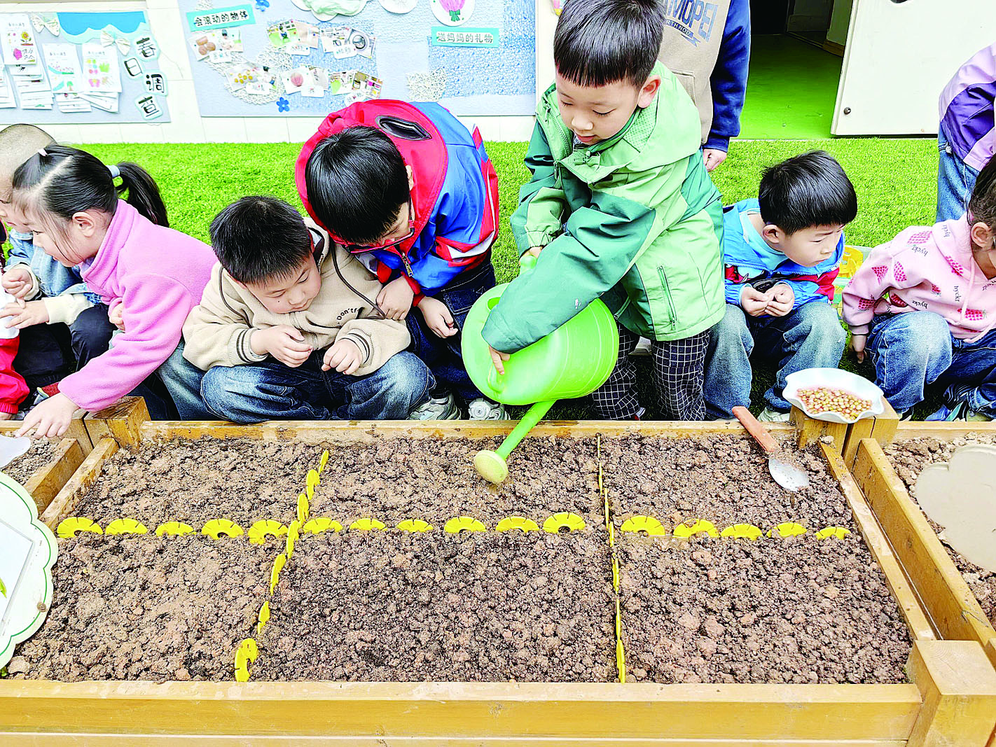 活动中,教师们带领孩子们分组前往种植箱,孩子们小心翼翼地将种子种入土壤中,然后轻轻地盖上土,最后浇上适量的水。整个过程,孩子们都显得格外专注和投入。