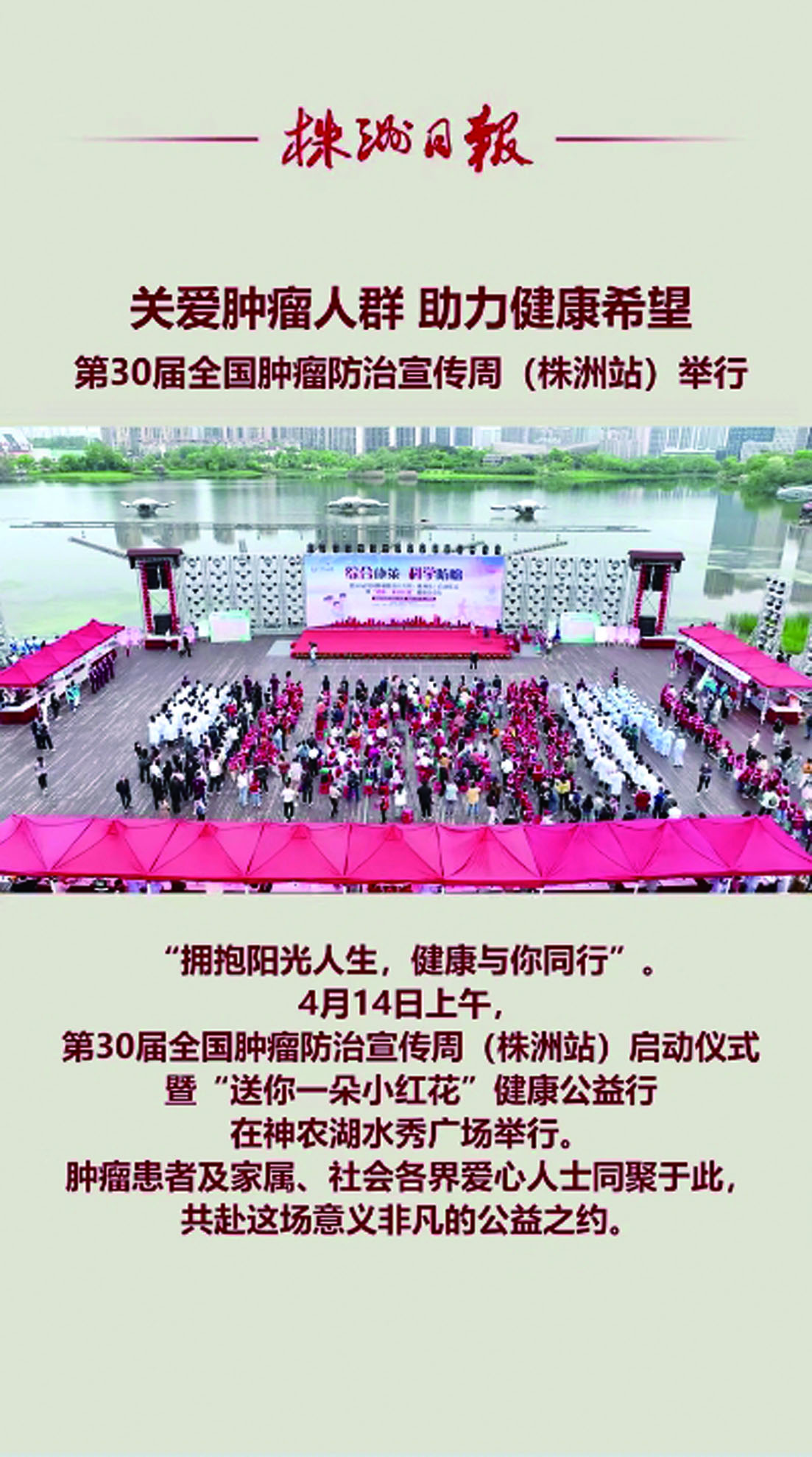 4月14日上午,第30届全国肿瘤防治宣传周(株洲站)启动仪式暨“送你一朵小红花”健康公益行在神农湖水秀广场举行。肿瘤患者及家属、社会各界爱心人士同聚于此共赴这场意义非凡的公益之约。