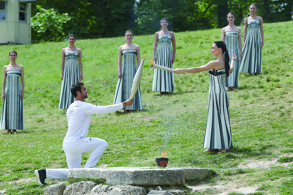 4月16日,扮演最高女祭司的演员玛丽·米娜(前右)取得圣火,点燃第一棒火炬手——希腊运动员、东京奥运会男子赛艇项目金牌得主斯特凡诺斯·恩图斯科斯手中的火炬。