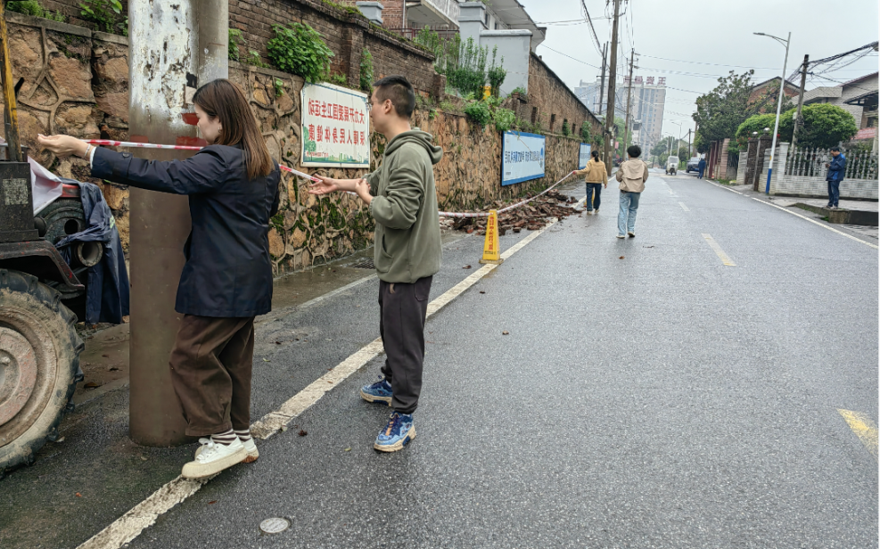 王丽娟一边组织同事维护现场秩序,引导居民和车辆绕行,一边拉起警戒线,设立警示牌,提醒附近居民远离这堵危墙。在确保安全的前提下,她们将松动的围墙部分推落,避免发生更大面积坍塌。