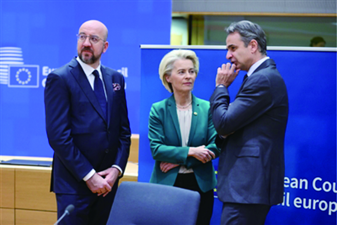 4月18日,布鲁塞尔,欧洲理事会主席米歇尔、欧盟委员会主席冯德莱恩和希腊总理米佐塔基斯(从左至右)出席欧盟特别峰会。