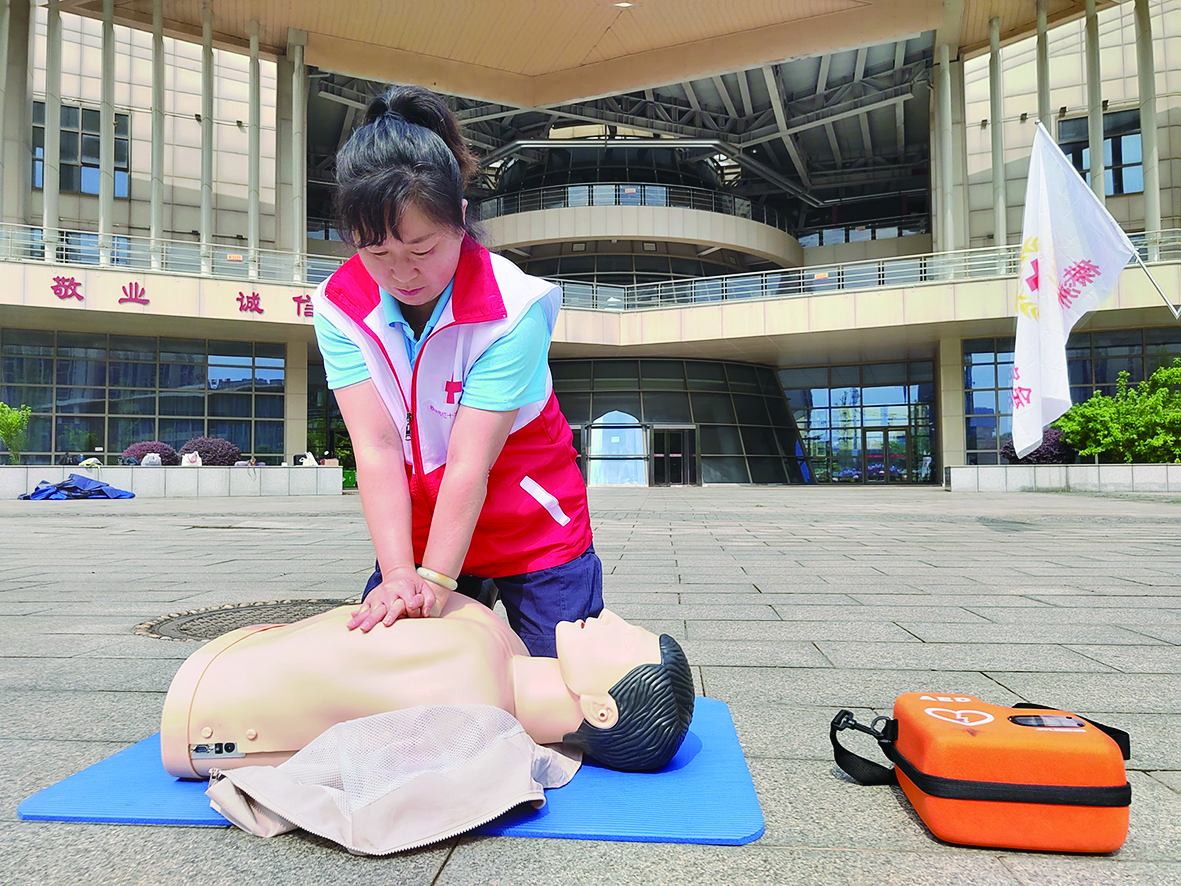 4月24日,市红十字会在市“三个中心”开展2024株洲马拉松赛事志愿者应急救护培训。全市300名红十字志愿者将历经心肺复苏、AED使用、中暑表象及处置、低血糖症表象及处置等多轮专业培训及路线演练后,持证上岗,为赛事提供高质量、高标准志愿服务。图为志愿者在培训现场练习急救。