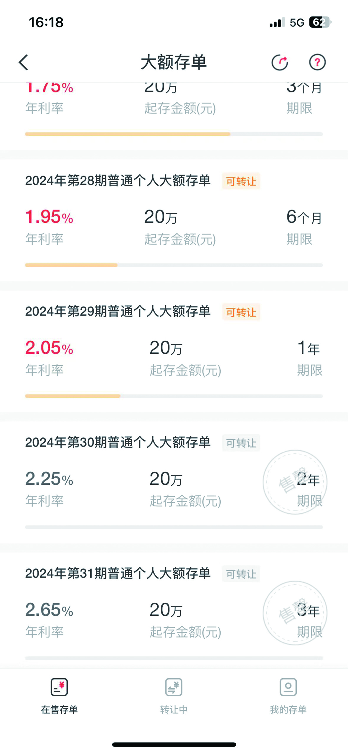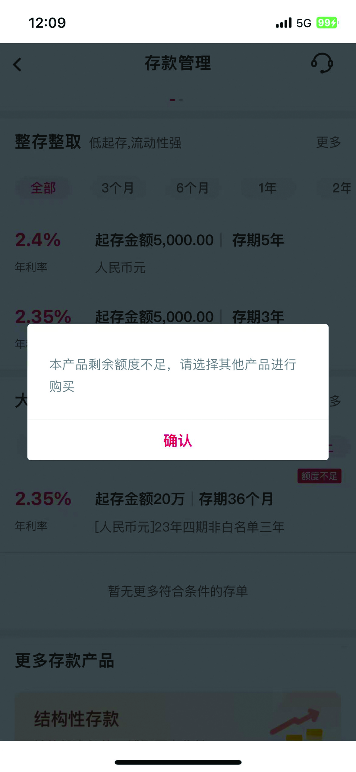 中国银行App上,24个月以上大额存单显示额度不足。