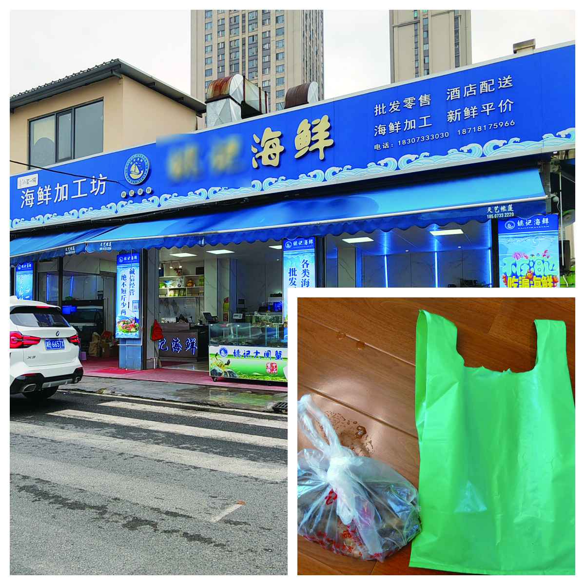 顾客如今在天纺农贸市场买海鲜的塑料袋(左)及此前的加厚塑料袋对比。记者/易楚曈 摄