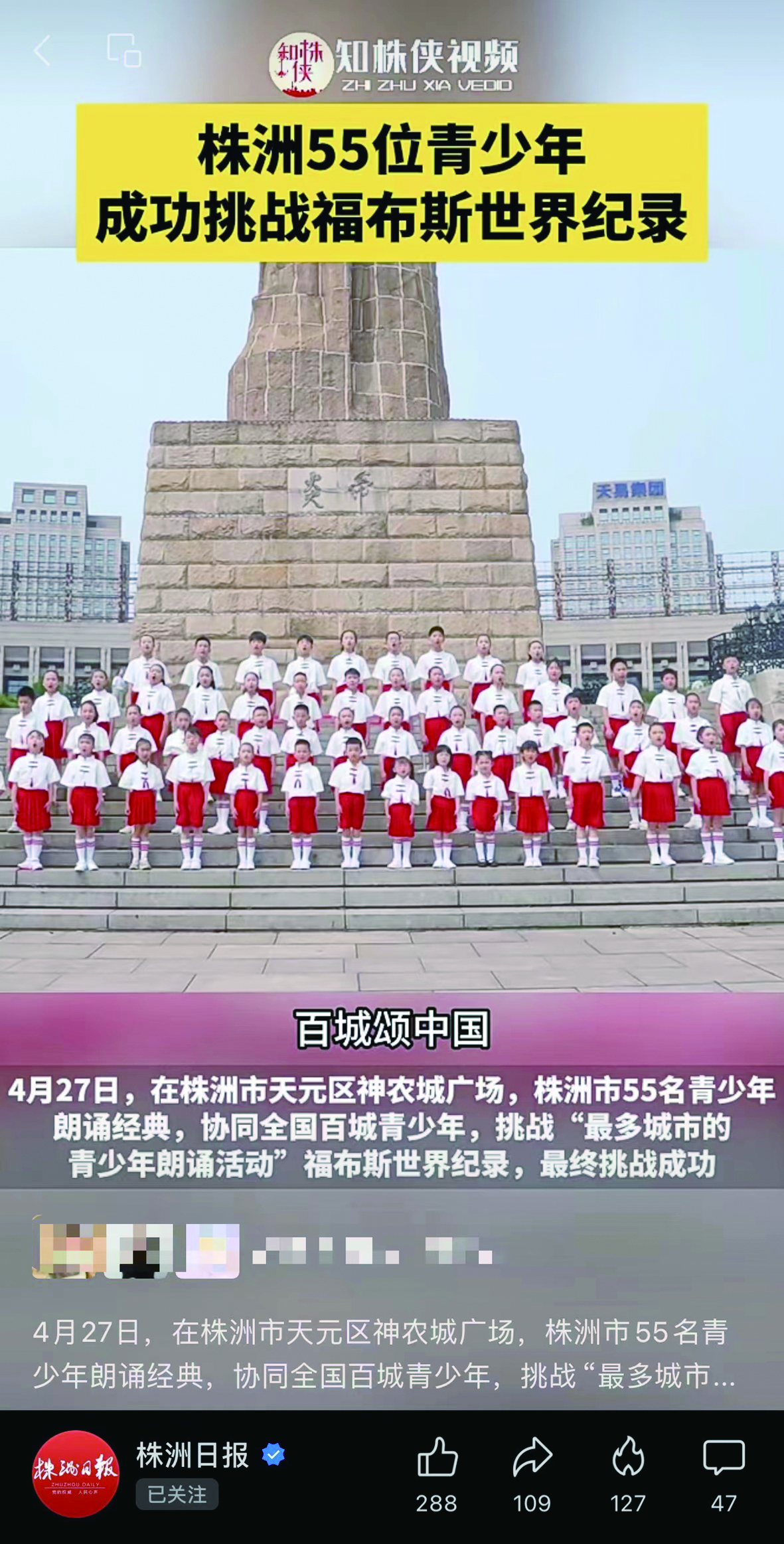 4月27日,我市55名青少年齐声朗诵《百城诵中国,共诉中国心》,与全国百城小朋友一起,共同挑战“最多城市的青少年朗诵活动”福布斯世界纪录,最终挑战成功。