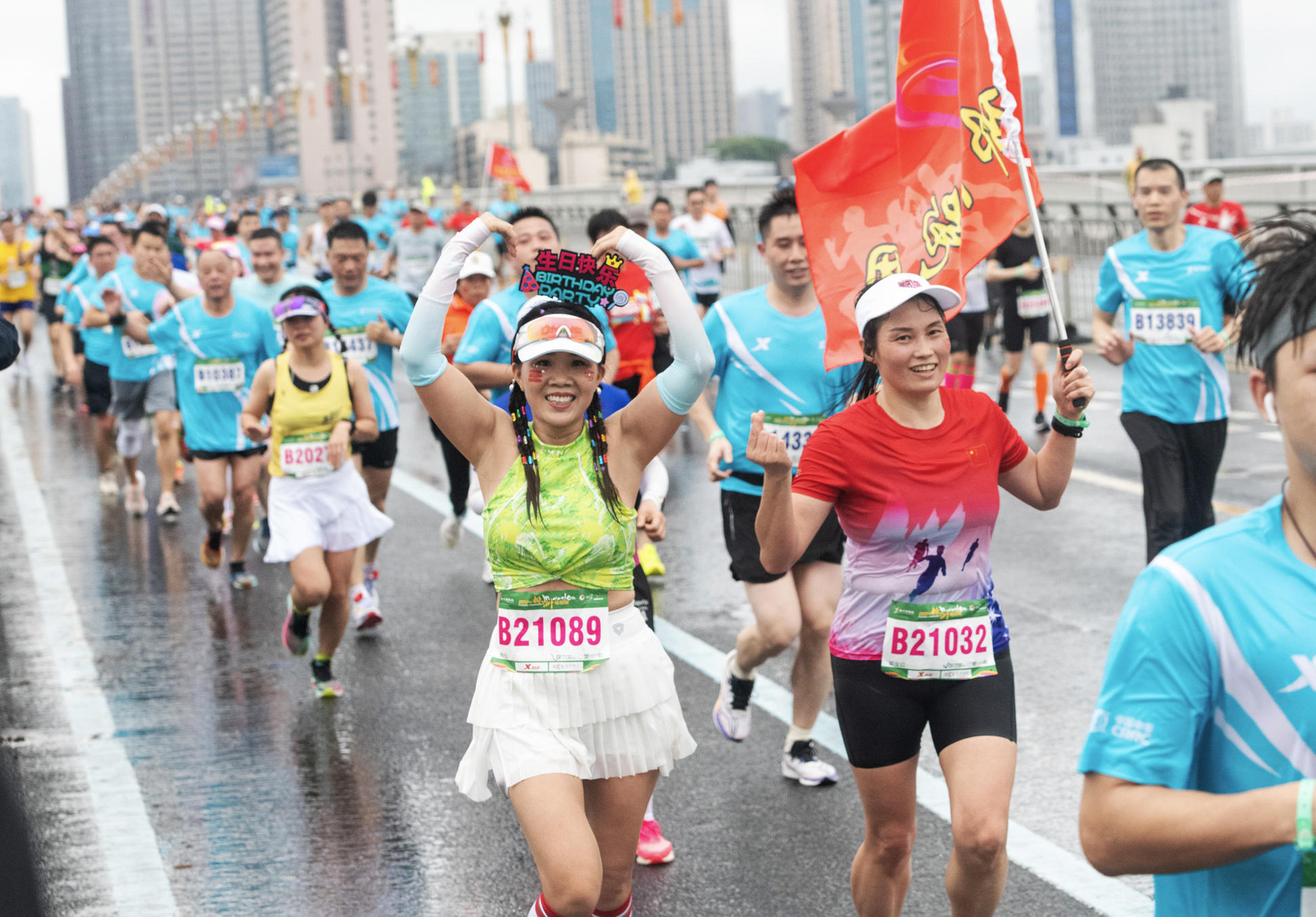 5月4日上午,2024株洲马拉松赛鸣枪开跑,1.5万名国内国际跑友同场竞技,奔跑在湘江两岸“株洲城区最美赛道”,感受山水洲城的独特魅力。图为跑者戴着“生日快乐”头冠比心。郑安戈 摄