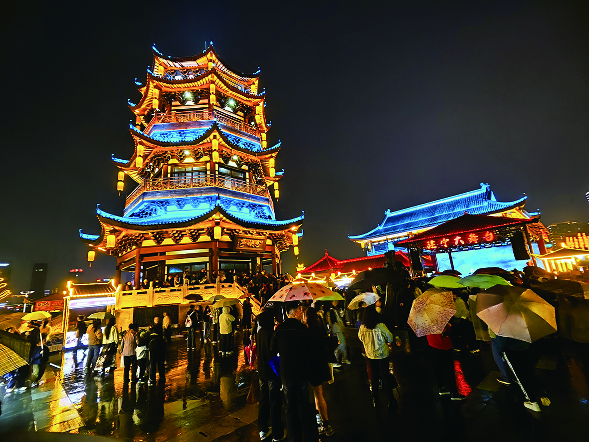 市集不远处,是一片“光的海洋”。全息投影灯光绽放的流星光,装点出令人惊艳的浪漫诗意夜景,引得市民游客流连忘返。
