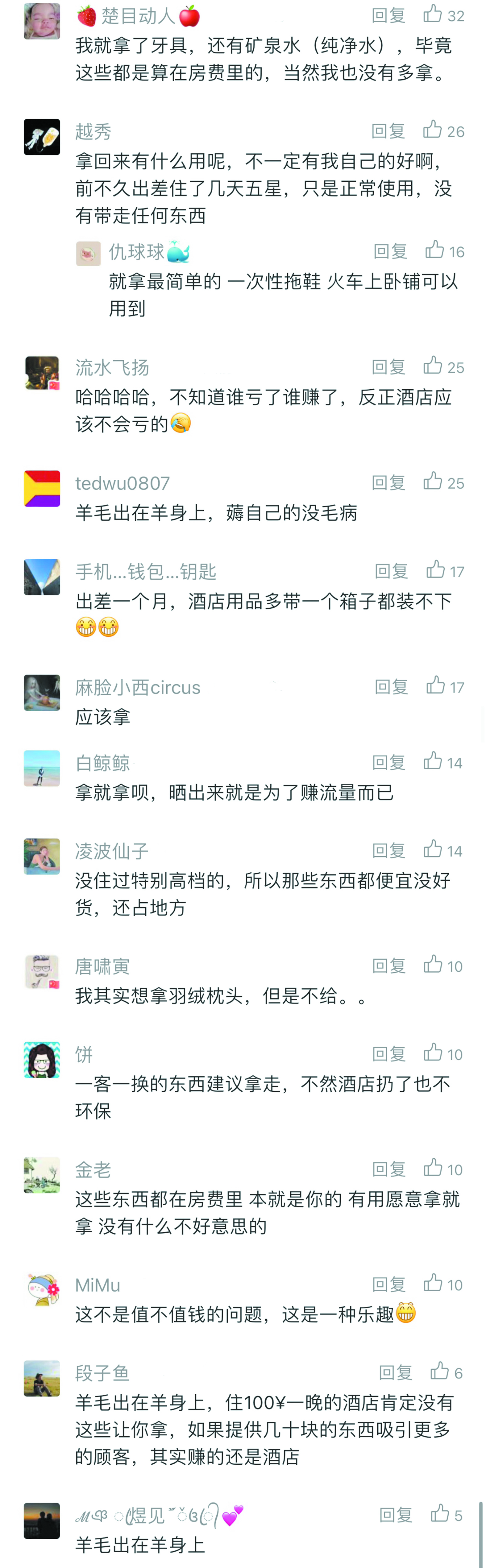 文志宏同时揭示了一个行业内幕,即这些看似“免费午餐”的高端用品实际上已计入了房间的整体成本之中。换言之,顾客带走的每一份“羊毛”,酒店早已在定价策略中做了考量,确保不会超出其财务容忍度。这意味着,顾客按需取用这些免费品是被允许且预期的,但应基于实际需求。
