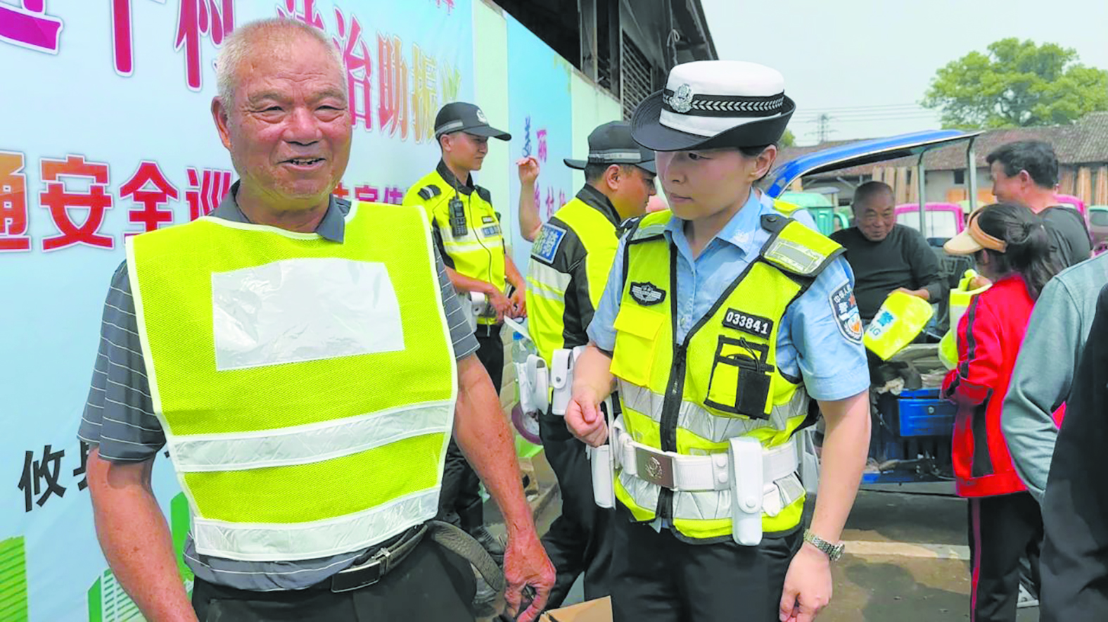 交警结合辖区道路交通事故典型案例和常见交通违法行为,重点讲解了农用车和二、三轮摩托车违法载人、人货混装、无牌无证、酒后驾驶、超员超载、报废车辆上路以及骑乘摩托车、电动车不戴安全头盔等各类交通违法行为的危害性和严重后果。同时,介绍“一盔一带”常识,引导“一老一小”群体增强文明交通意识、提高自身保护能力。图为4月29日,攸县交警在谭桥市场宣传现场给群众穿上反光背心。
