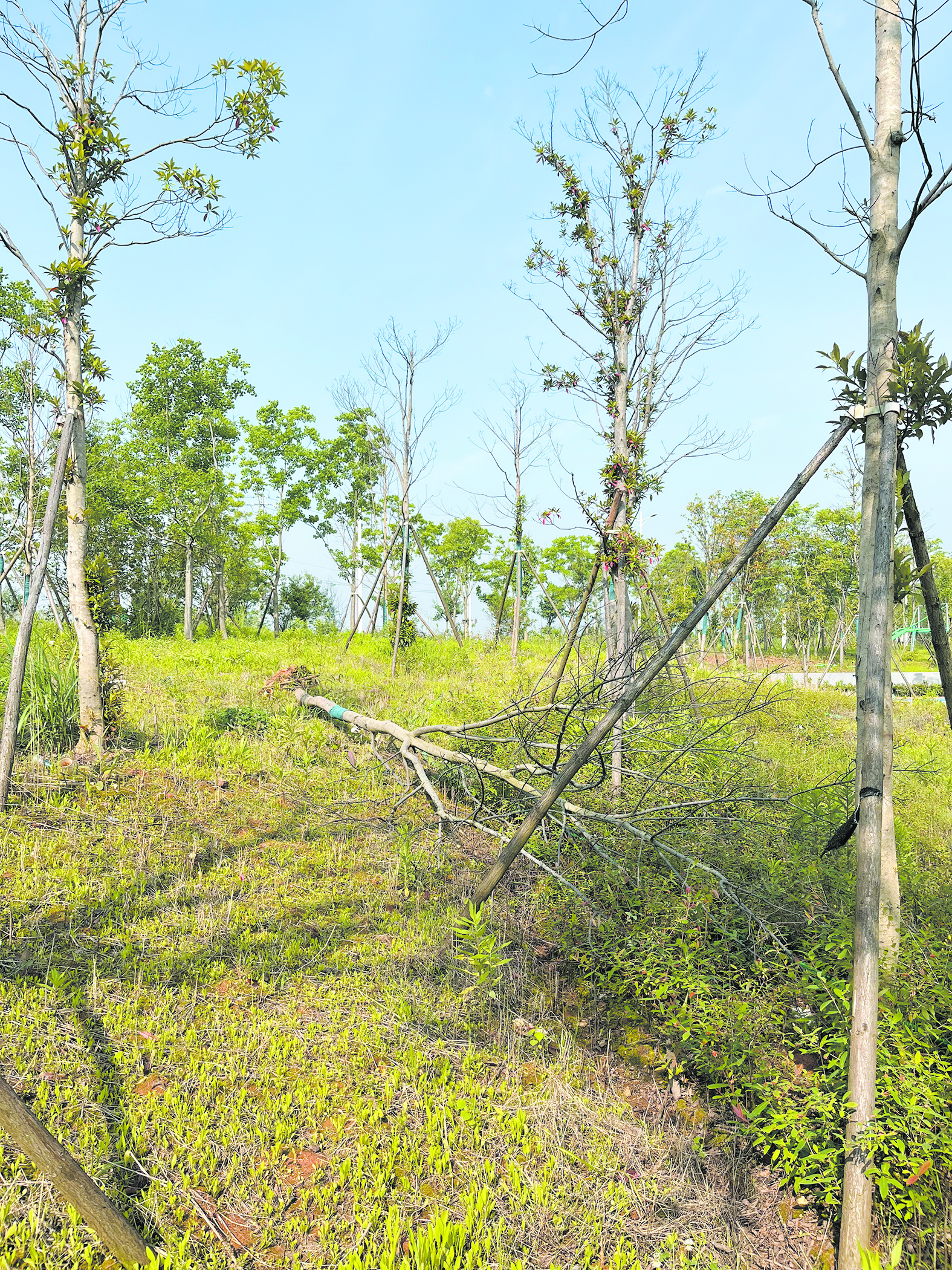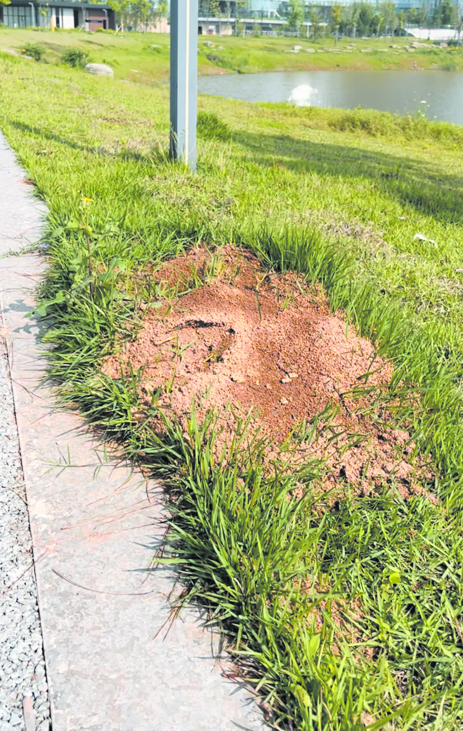 5月8日,本报记者对该公园内“倒树无人扶”现象进行了回访,发现部分倒伏的树木已扶正。有游玩市民发现,游道边草地上,出现了不少疑似红火蚁的蚁巢,大的蚁巢有脸盆大。