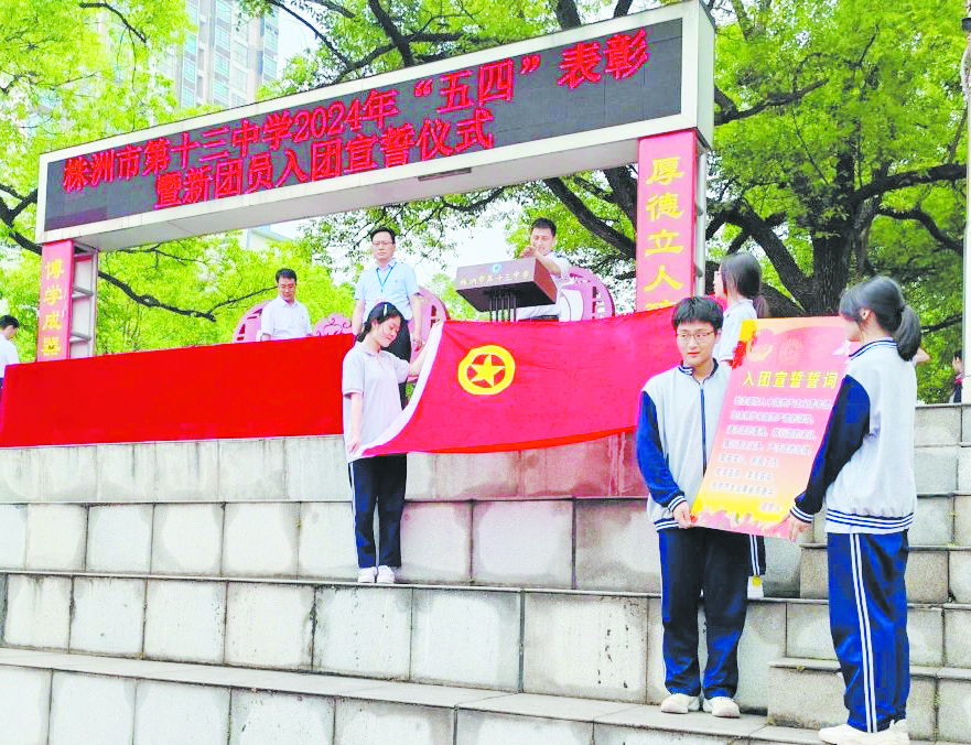 在“五四”青年节来临之际,株洲市第十三中学举行2024年新团员入团仪式暨“五四”系列表彰仪式,一批新队员带上团徽,成为光荣的共青团员。
