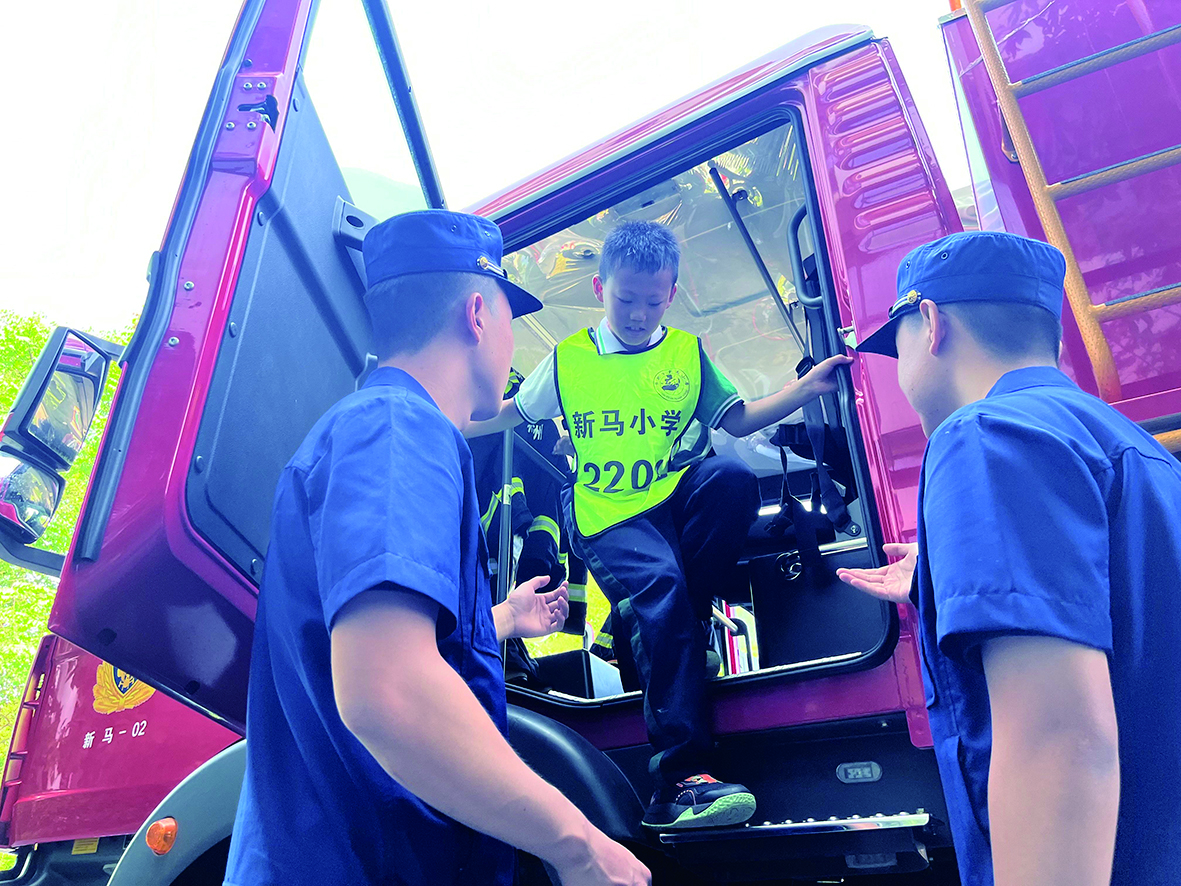 5月14日上午,天元区新马小学里小学生们惊叹声不断。原来,天元区马家河街道联合新马消防中队等单位开展防灾减灾疏散演练活动,5辆消防车开进校园,给2500余名孩子送上了一堂别样安全课。图为小学生在演练现场。