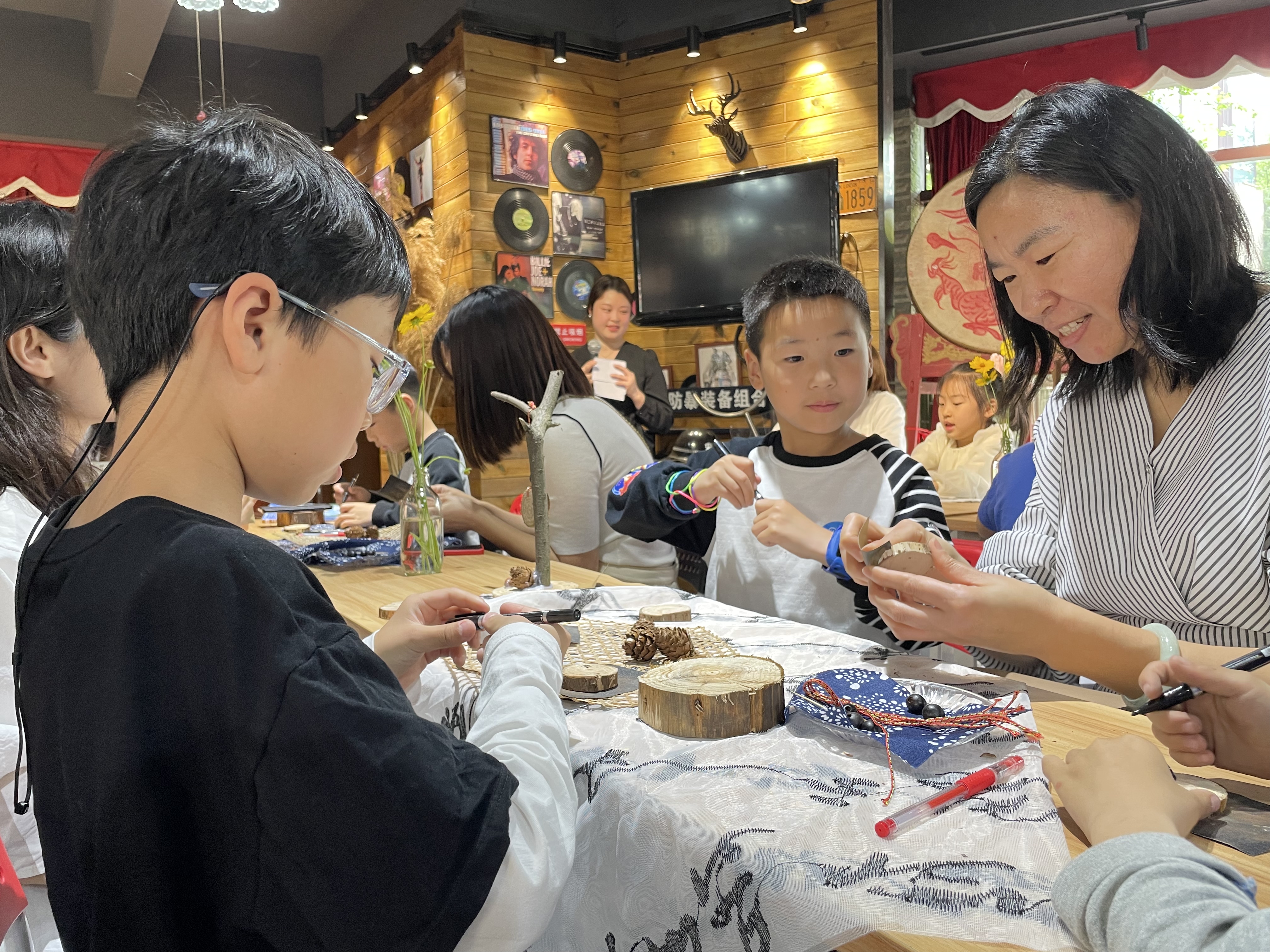 5月12日一大早,芒果图书馆里聚集了20多组亲子家庭,大家围绕“年轮的秘密”主题,制作一款手工作品送给母亲。从树干锯下1厘米厚的底座,观察年轮,在底座上钻孔、绘画、创作独一无二的摆台或挂件作品……