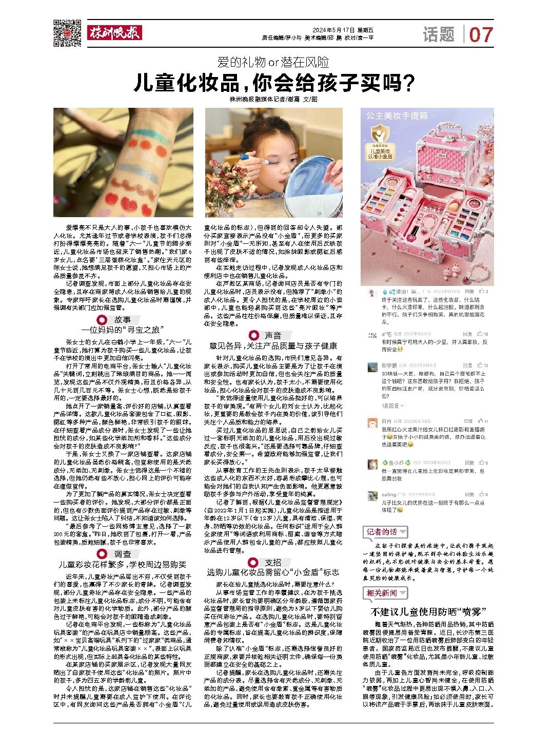 记者调查发现,市面上部分儿童化妆品存在安全隐患,且存在商家将成人化妆品销售给儿童的现象。专家呼吁家长在选购儿童化妆品时需谨慎,并强调有关部门应加强监管。