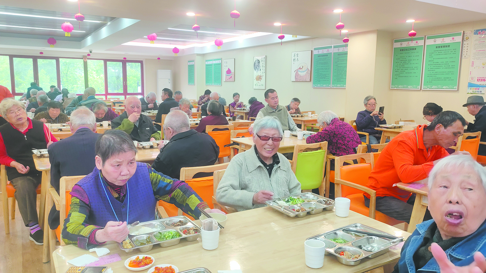▼老人正在食堂开心用餐。