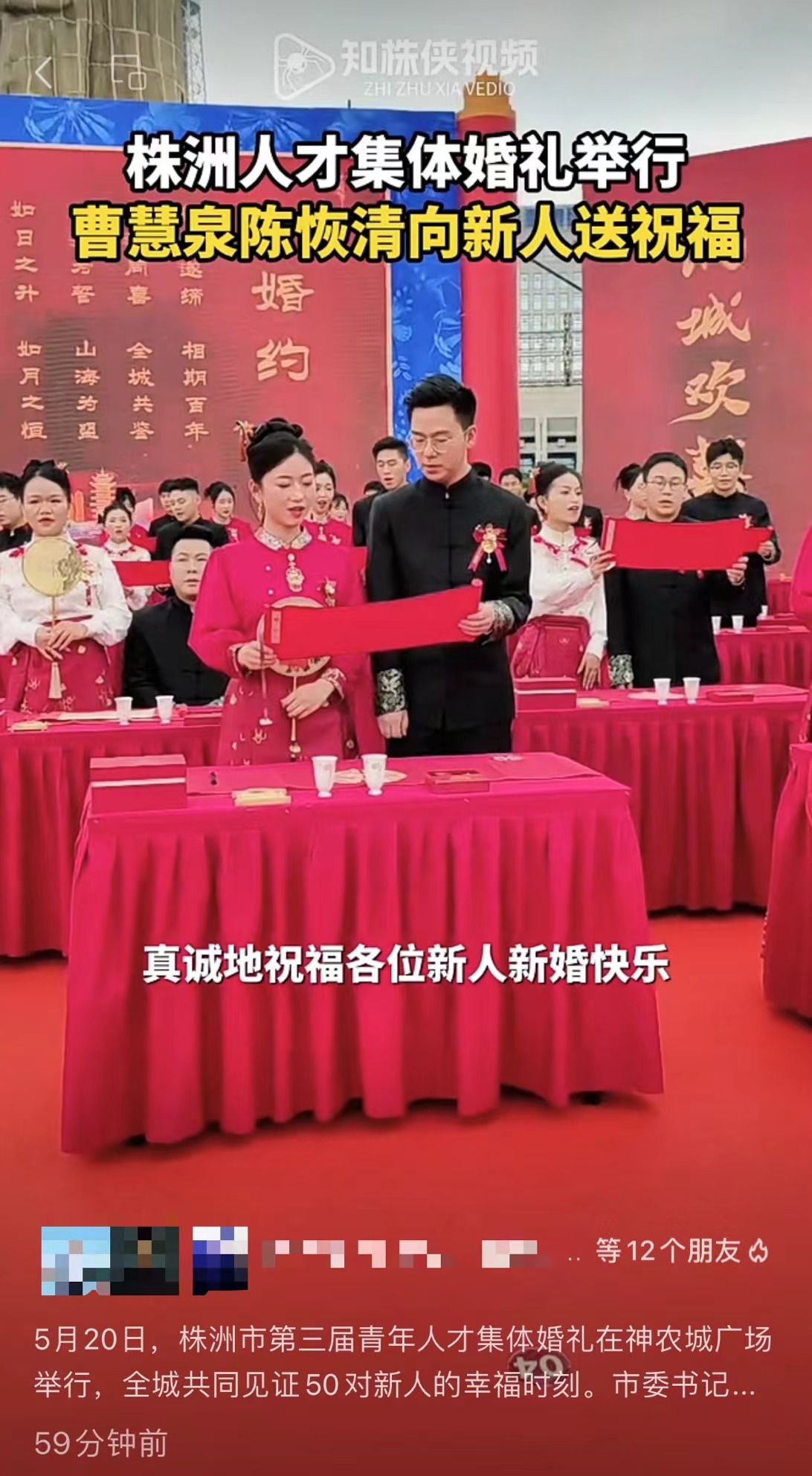 株家有喜,满城欢喜。昨日恰逢“520”爱情告白日,第三届株洲青年人才集体婚礼在神农城广场如期举行。市委书记曹慧泉以写信的形式为新人送上祝福,市委副书记、市长陈恢清以证婚人身份出席并为新人颁发证婚书。