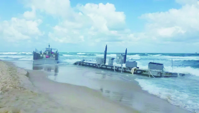 据以色列媒体报道,5月25日,在风浪冲击下,美军花3.2亿美元打造的加沙临时码头部分结构脱落并漂入海中(如图),美军人员随后将其拖回并重新进行了固定。(据百度新闻)
