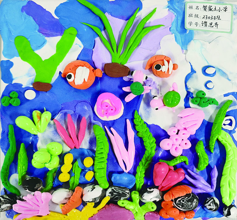 我的手工作品材料是超轻粘土。先用深蓝、浅蓝、白色粘土交叠平铺在画布上,做出浮动的海水效果,再拿绿、粉、橘、红等颜色粘土利用揉、压、刀刻的手法做出海草和珊瑚,最后揉捏出几只可爱的乌龟和小鱼,一幅缤纷的海底世界立体图就完成了。海底世界是多么的多姿多彩,让我一起来守护她吧!