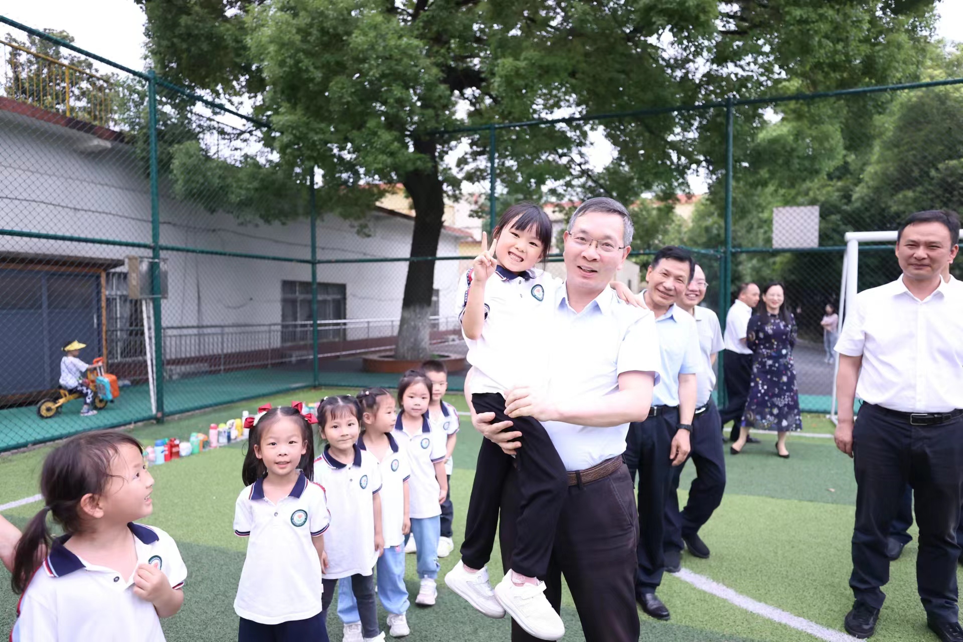 来到美的小学,少先队员为陈恢清佩戴上鲜艳的红领巾。陈恢清走进操场、食堂等地察看,详细了解学校基础设施建设、教学特色、教育管理、校园安全等工作情况,并走进图书室与孩子们聊天,送上节日祝福,并互赠礼物。