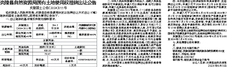 炎陵县自然资源局国有土地使用权挂牌出让公告