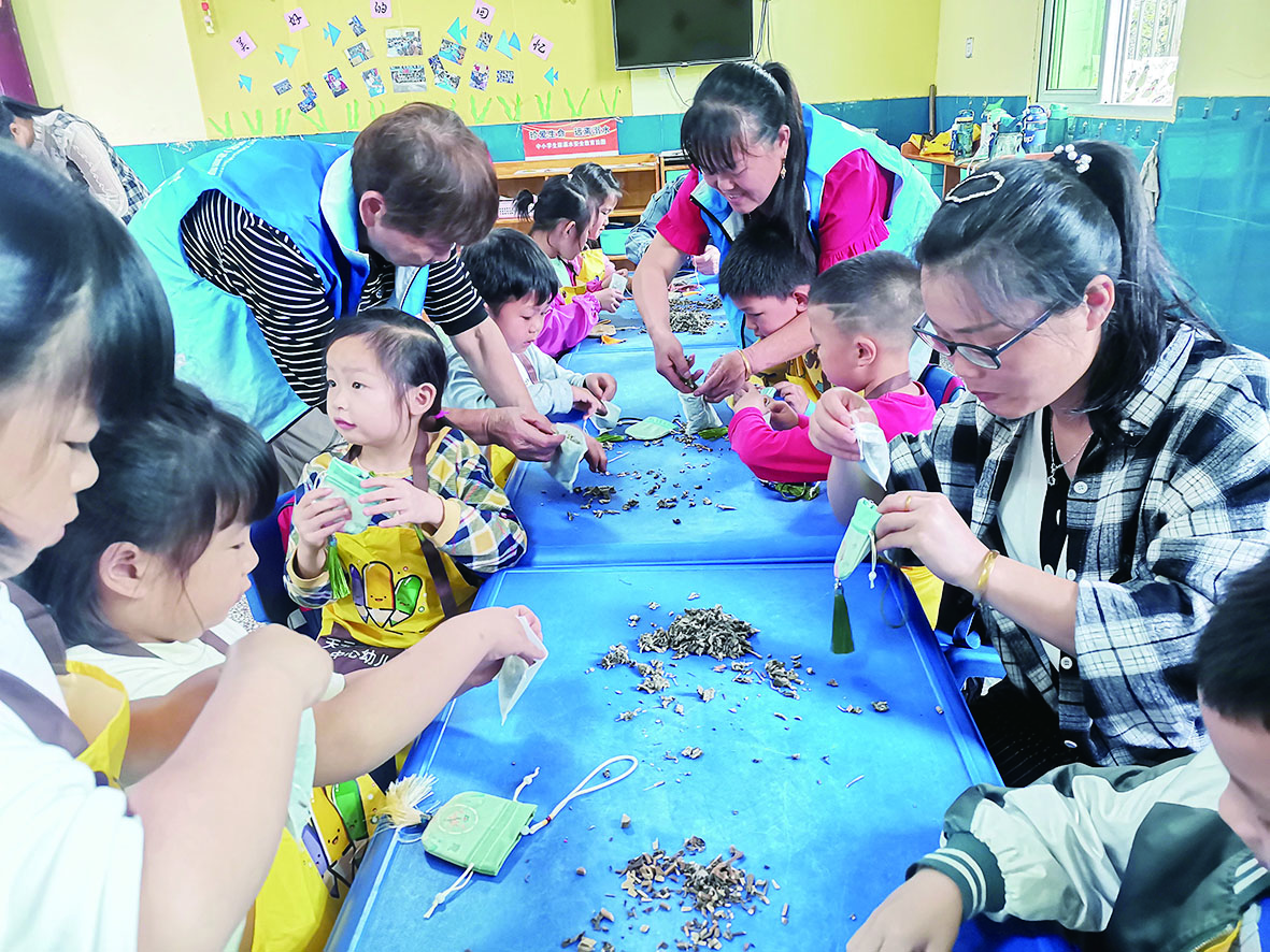 6月6日,天元区雷打石镇砖桥村在雷打石中心幼儿园,开展“巧做香囊祈福,绘就端午安康”志愿服务活动。萌娃们在志愿者的带领下动手做香囊,只见他们将中草药倒入香囊并压紧压实后封口,点缀上各色流苏,很快,一个个造型精美的香囊就出炉了。小朋友们还把吃粽子、赛龙舟、挂艾草等端午习俗画下来,感受到浓浓的端午氛围。