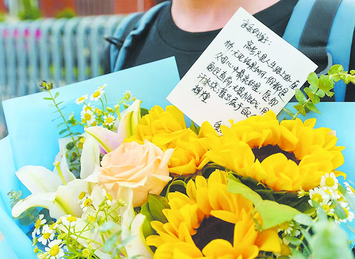鲜花上,妈妈手写了一份祝福贺卡。 记者/戴凛 通讯员/刘艺琴 供图