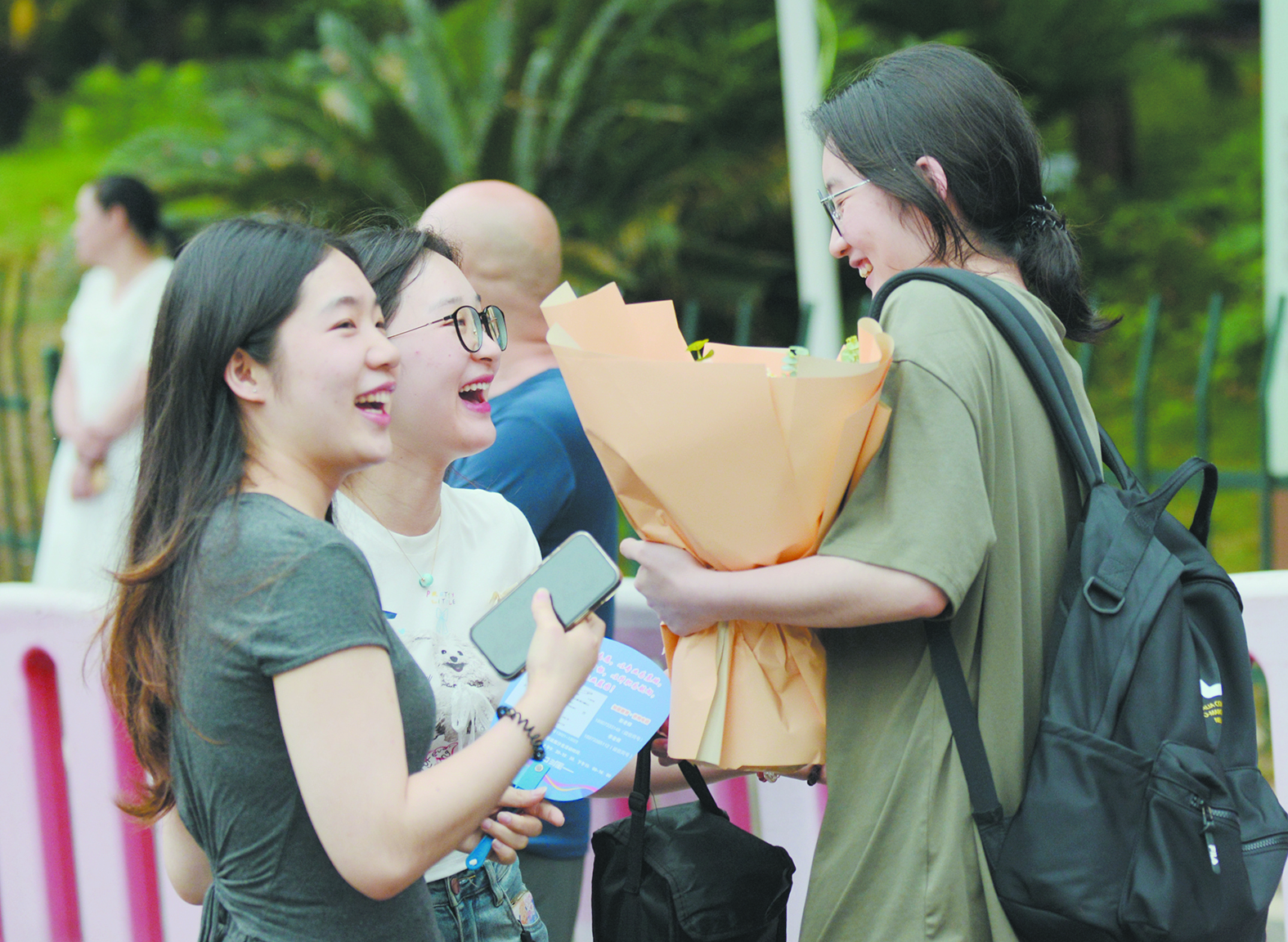 株洲市一中考点,考后闺蜜相见,笑脸盈盈。 记者/戴凛 摄