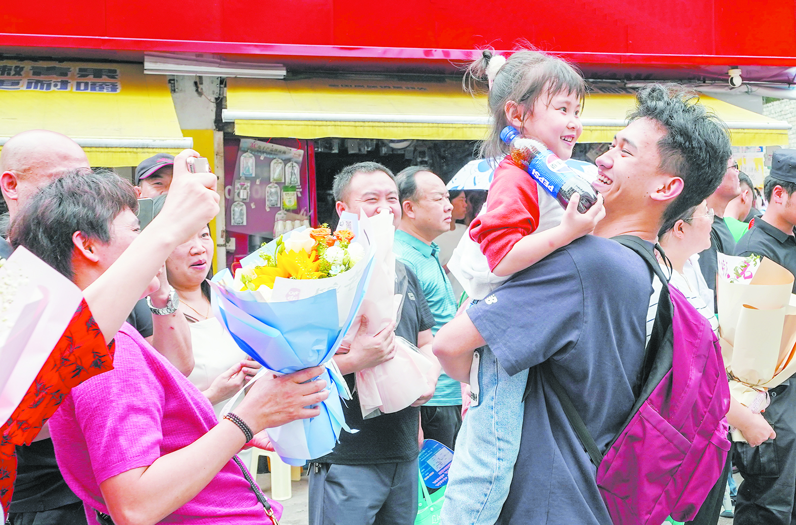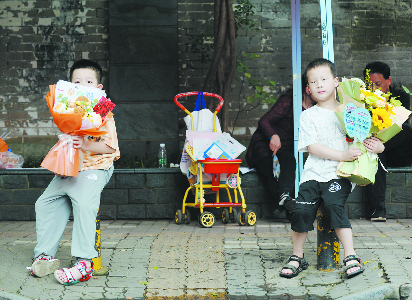考点外,小朋友手捧鲜花静候佳音。 记者/戴凛 摄