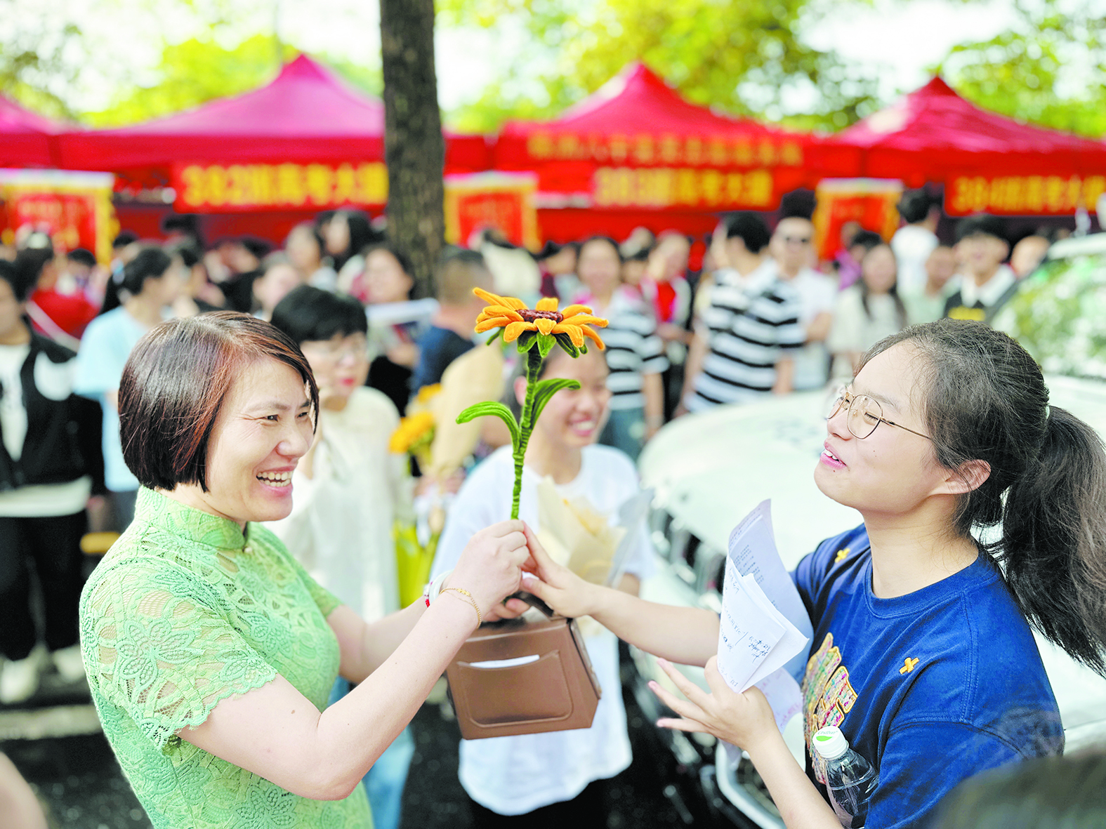 株洲市八中考点,班主任(左)让每位考生摸摸向日葵,一举夺魁。 记者/戴凛 摄