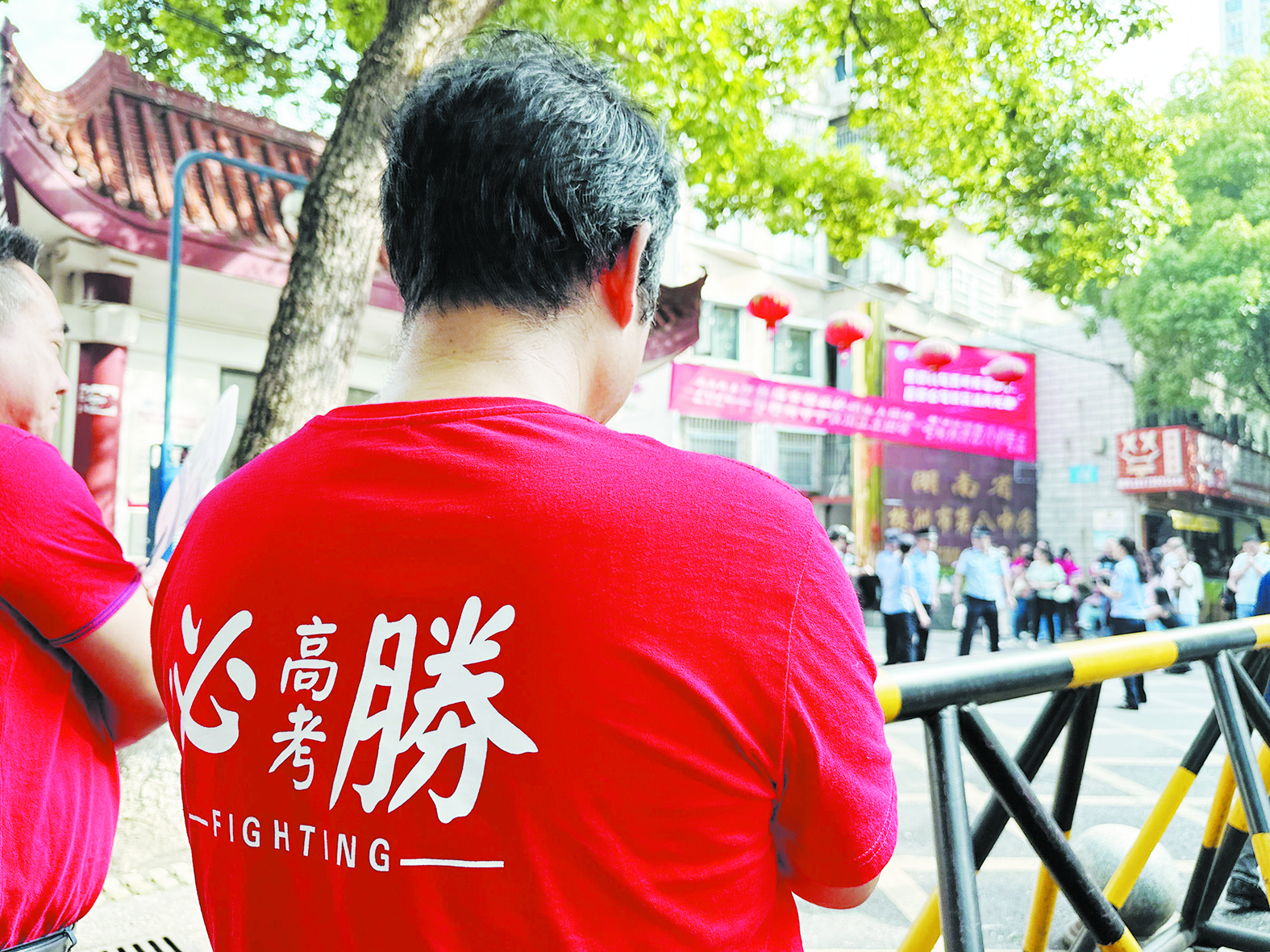 家长穿上红衣,为考生加油祝福。 记者/戴凛 摄