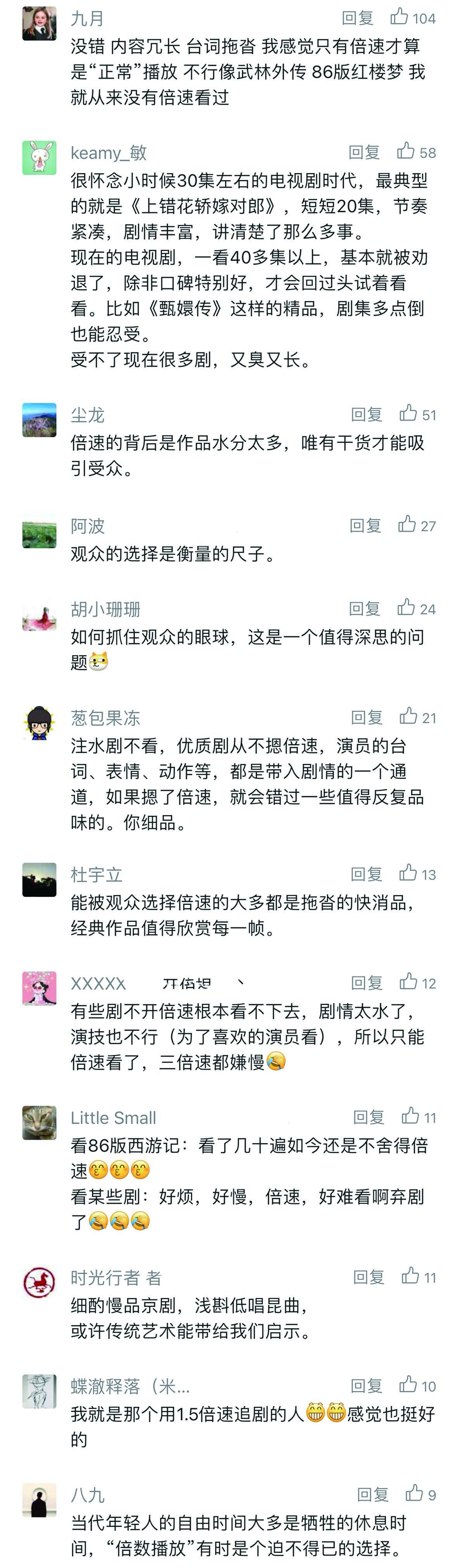 对于“倍速播放”,市民们观点和看法不一。有人认为,倍速降低了观剧质量,牺牲了创作者的艺术表达;另一些人则认为,这是面对低质内容的有效过滤机制。“就像看书,好书总想慢慢品味,而一般的书会快速浏览。”一位市民如是说。