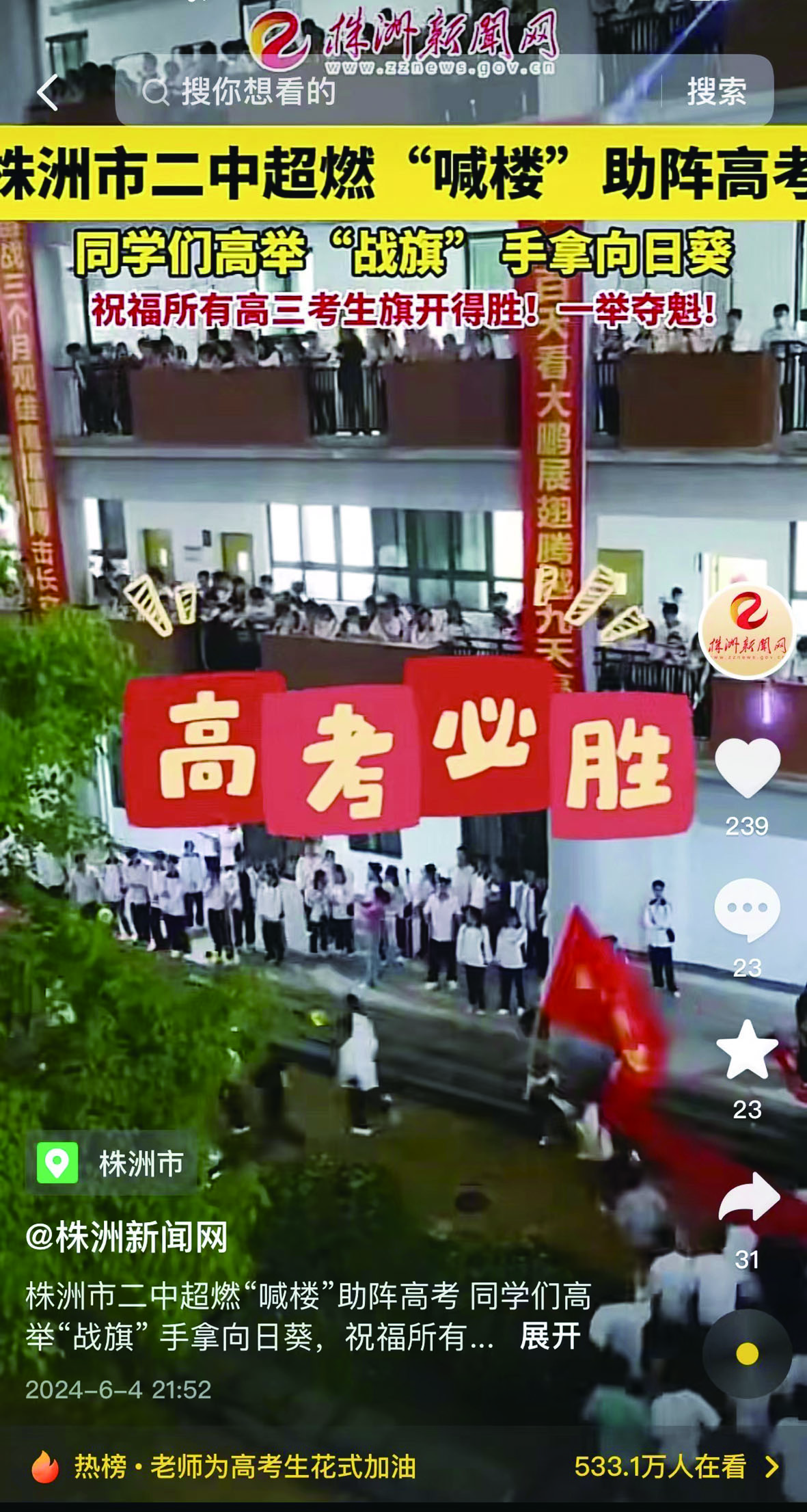 株洲市二中,一场青春洋溢的“喊楼”活动热血上演。同学们高举“战旗”手拿向日葵凝聚成一股股强大力量,为高考打气加油!