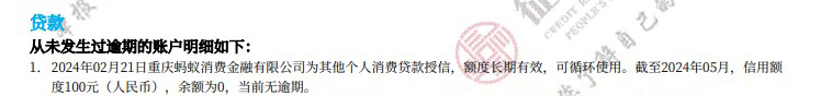 陈女士的征信显示,2024年2月21日,蚂蚁金融为她进行了一次个人消费贷款授信,额度长期有效且可循环使用。截至2024年5月,信用额度为100元,其中余额为0元。“我随后联系了花呗客服,得知这100元额度是由蚂蚁金融合作的第三方机构提供的。”陈女士称,她使用花呗支付的100元额度,正是从这家金融机构中刷出的。