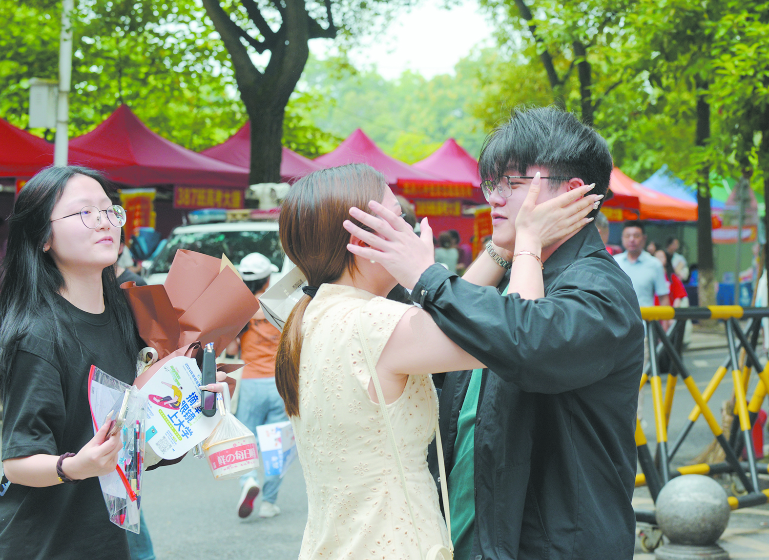 高考后,妈妈喜极而泣,儿子帮妈妈擦拭泪水。 记者/戴凛 摄