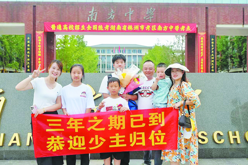 株洲市四中考点,考生兴奋地抱起小朋友。 记者/刘震 摄