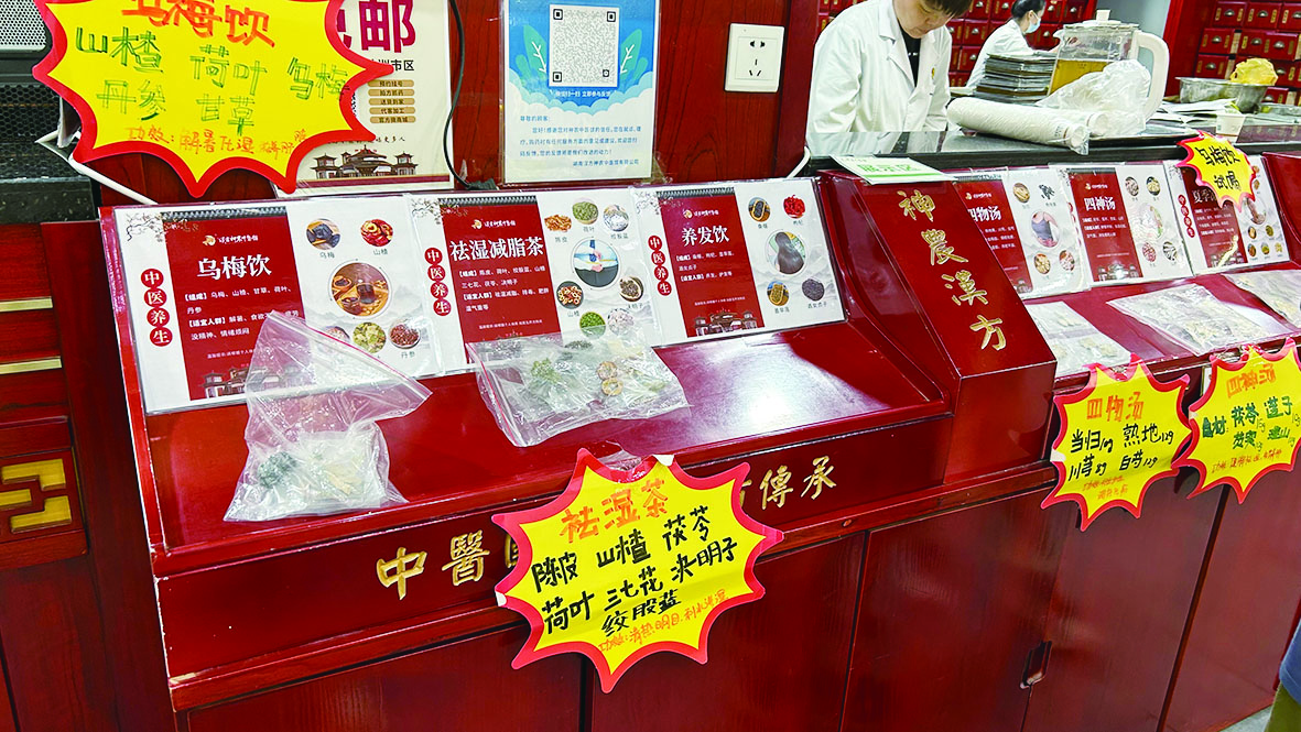乌梅饮、祛湿茶、四物汤、四神汤……在湖南汉方神农中医馆的显眼处,摆放了几款中医养生饮的介绍。旁边的养生壶里还有泡好的乌梅饮,供市民免费试喝。