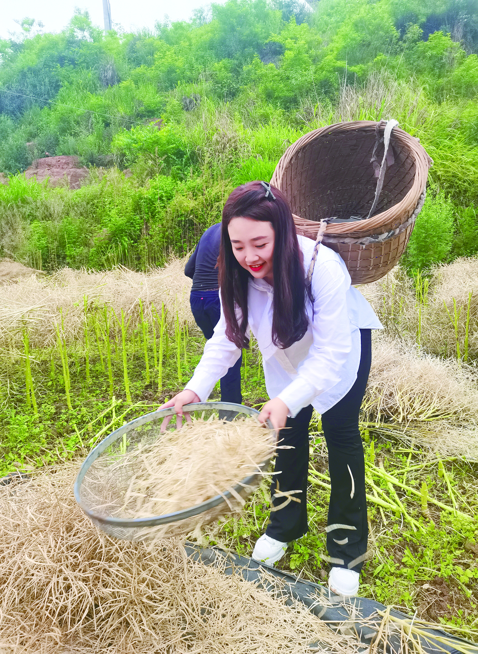宋玺在当地帮村民收油菜籽。(受访者供图)