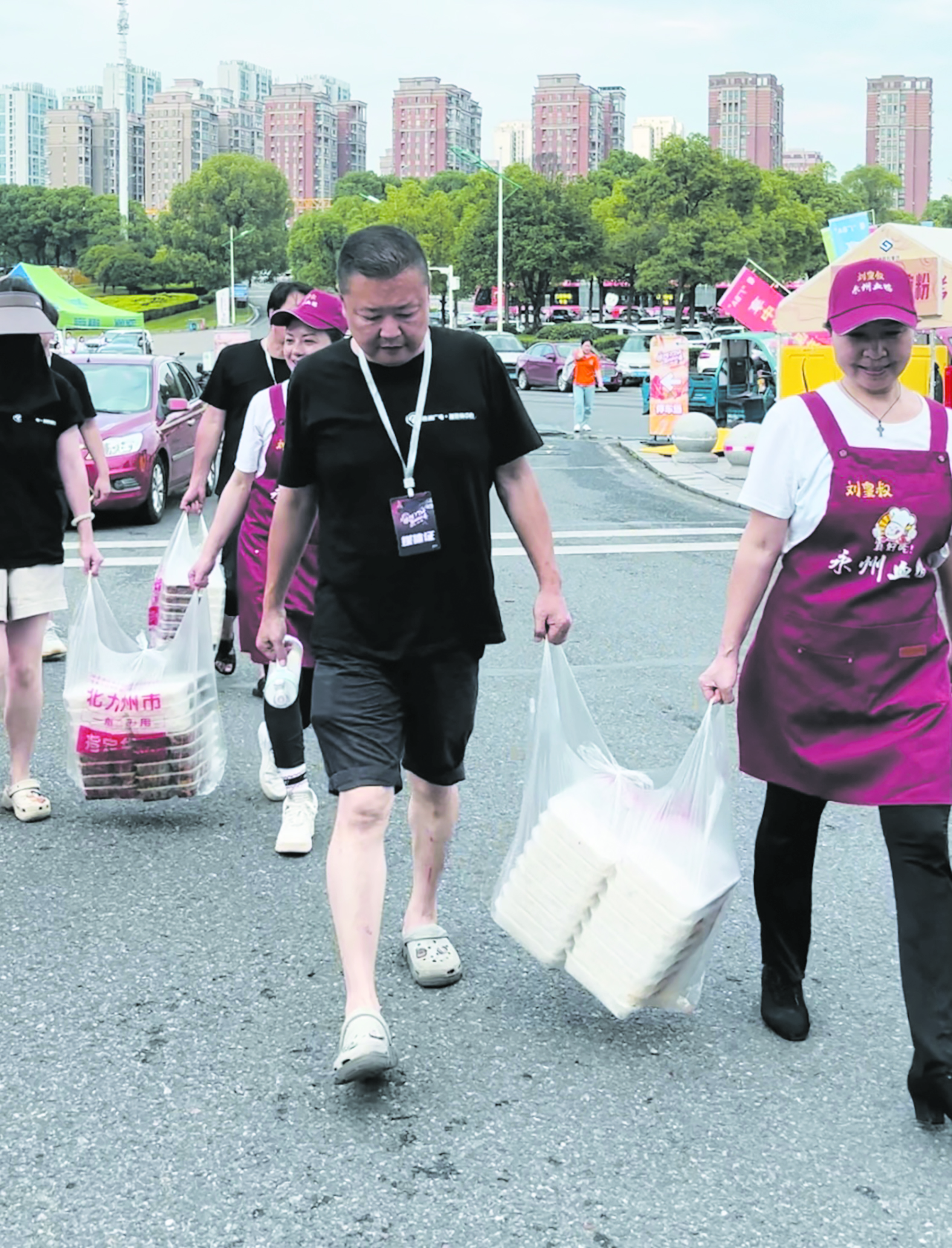 本报讯(株洲晚报融媒体记者/刘平) 将饭菜迅速打包并送餐,让用餐者吃上热饭热菜……6月14日下午5时30分左右,“刘皇叔永州血鸭”店的员工准时将打包好的美味饭菜送到2024株洲“厂BA”篮球锦标赛赛场的工作人员手中。