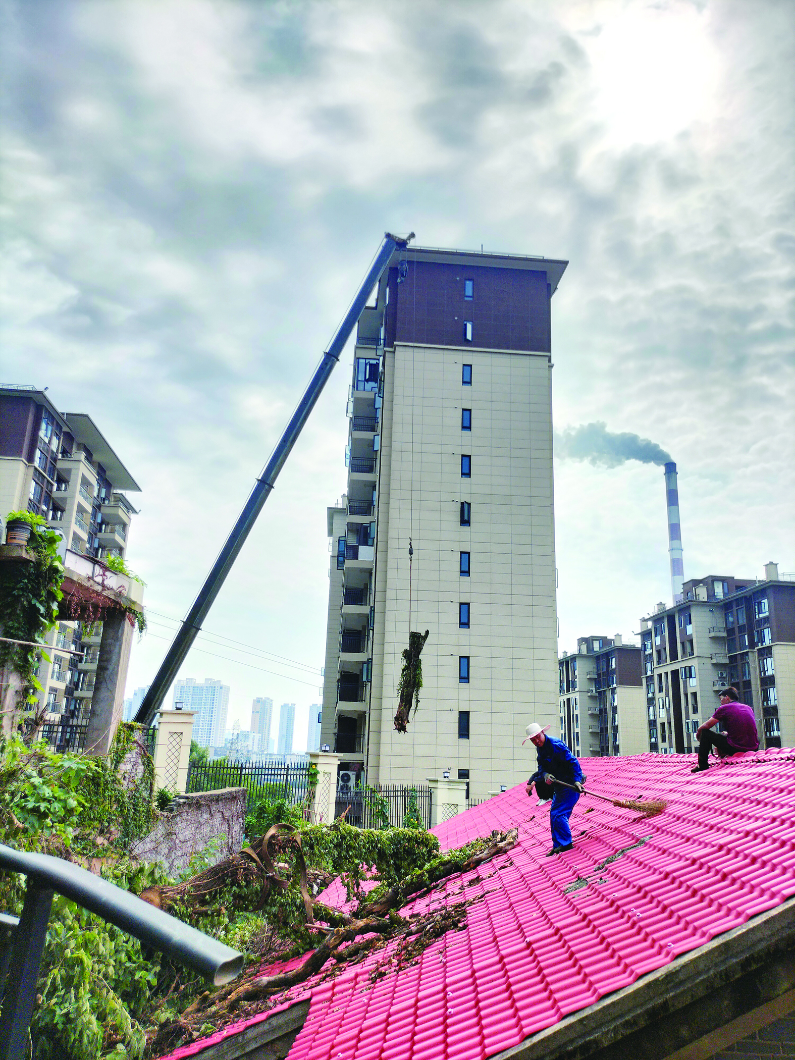 近日,石峰区响石岭街道白石港社区有梧桐树,直径约60厘米,高为15米,受近期持续降雨天气影响,土地松动导致倒塌,居民屋顶出现6处破损,存在安全隐患。白石港社区迅速响应,启动紧急处理方案,立即联系响石岭街道办事处协助处理。现场,工作人员携带手锯、绳索,对屋顶上的树木进行分段裁剪,通过吊车运下来,并对清理下来的树枝进行搬运,现场清理工作有序进行。