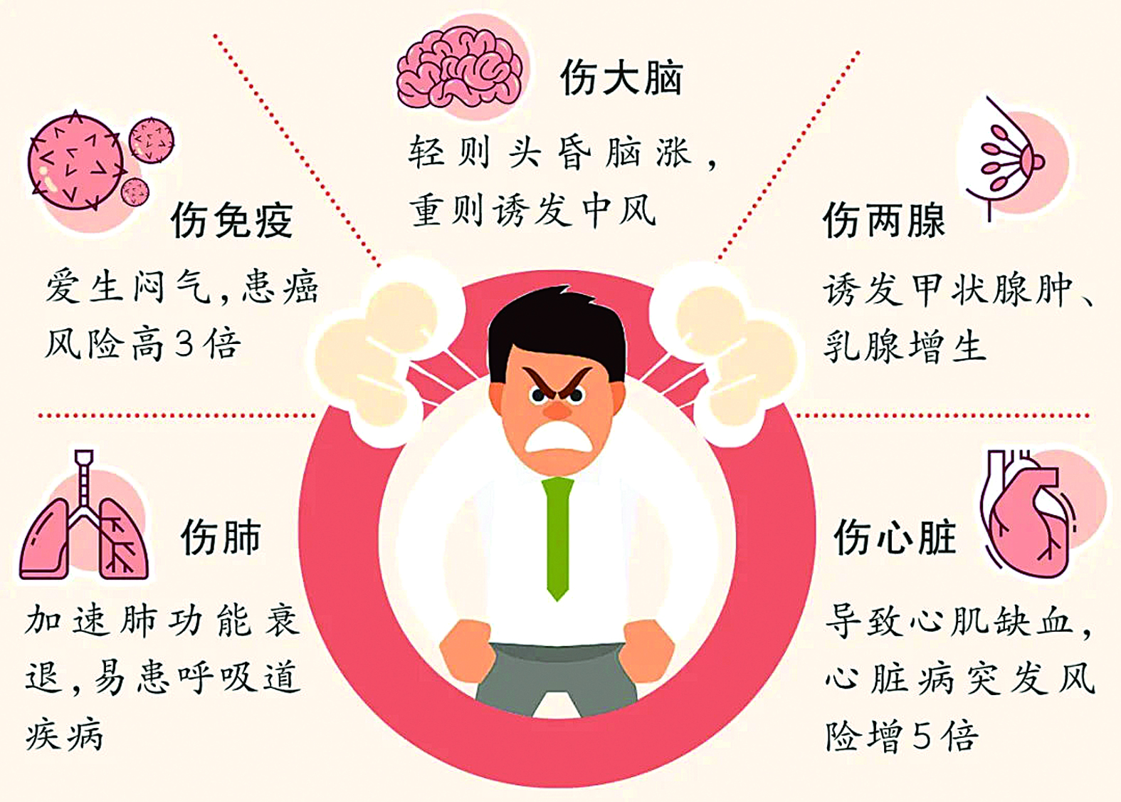 免疫力下降 哈佛大学研究发现,一次生气后的6小时内,身体内的免疫球蛋白A水平会受到影响。如果一个人长期处于生气的情绪当中,内分泌系统和免疫系统会逐渐失调,降低免疫力,增加感染疾病的几率。