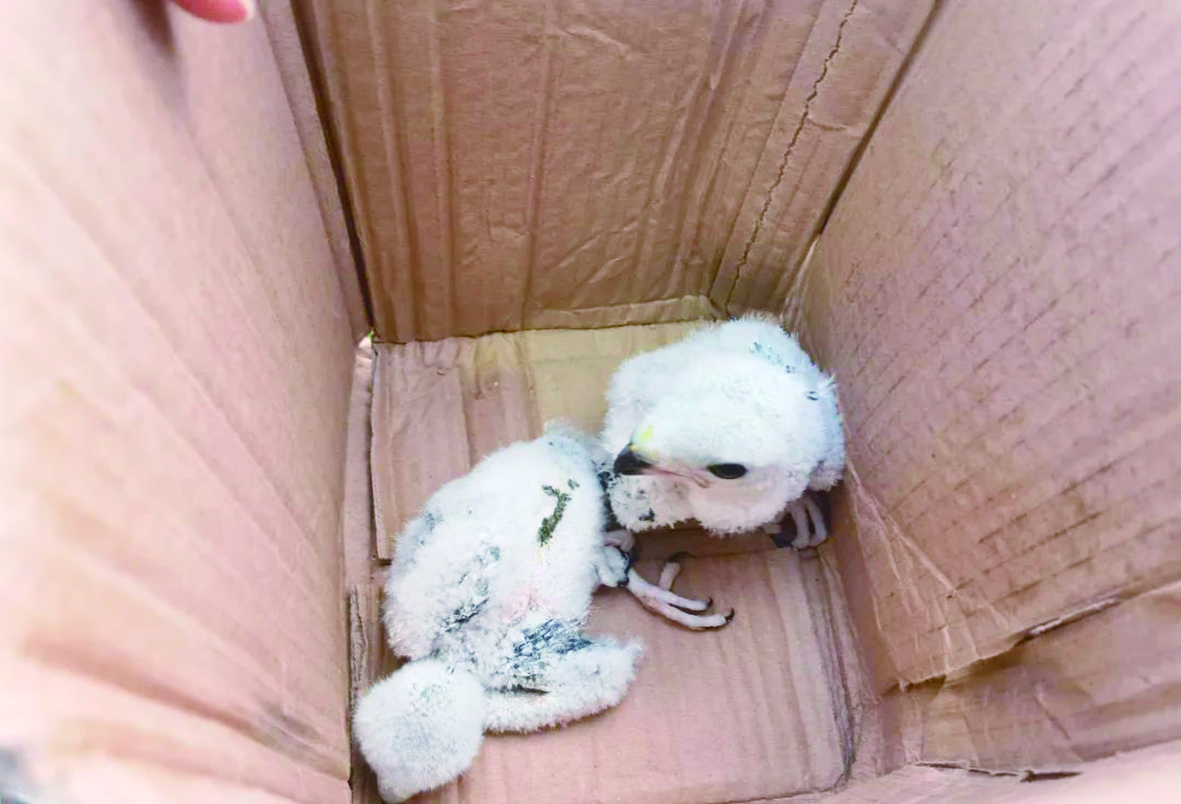 民警到达现场后,通过仔细比对,发现该鸟疑似国家二级保护动物——雀鹰,随即将两只幼鸟带至所内,并仔细查看科普资料、询问专业人士,对幼鸟进行救助喂食,同时与林业局取得联系。