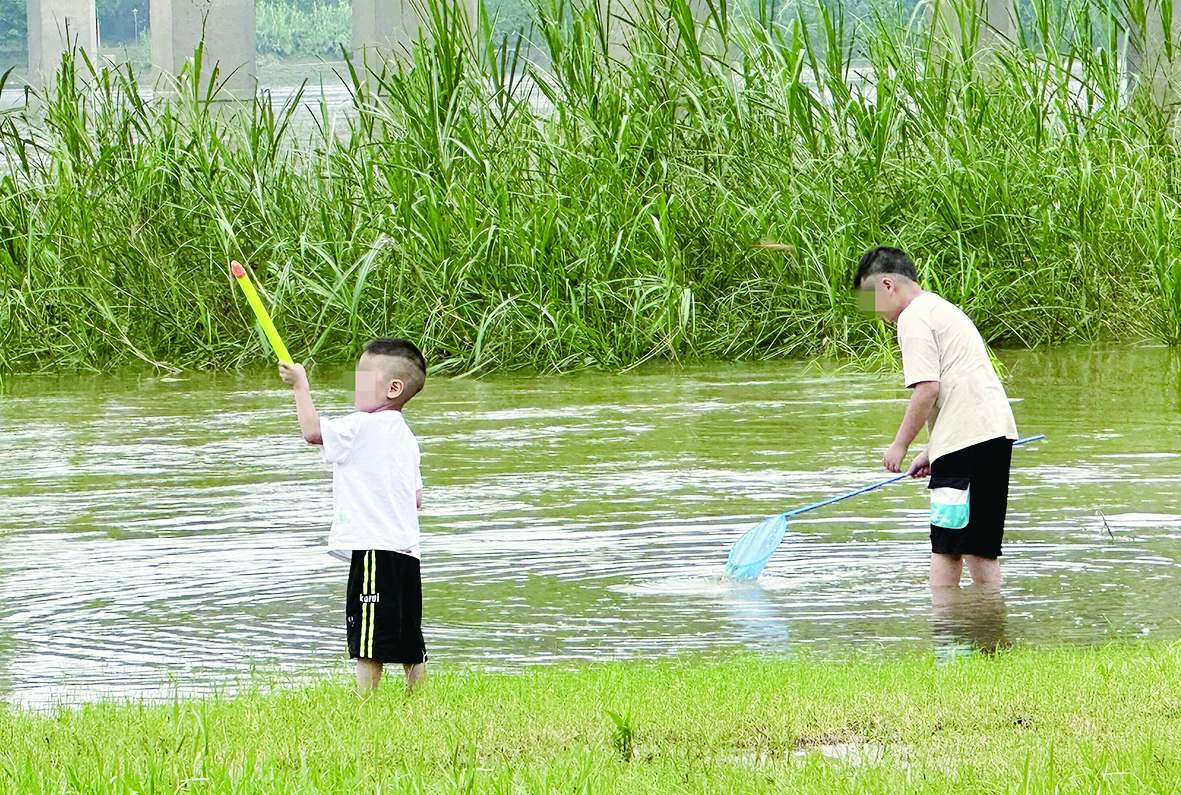 7月2日下午5时许,记者看到一名女性家长带着两名儿童在天元大桥下的江边玩耍。其中一名小学生模样的儿童拿着抄网,直接走进江水中打捞小鱼。另一名年龄更小的儿童,则拿着水枪不时弯腰在江水中灌水。而该家长却站在水边,时不时浏览手机,并未时刻关注孩子的位置。