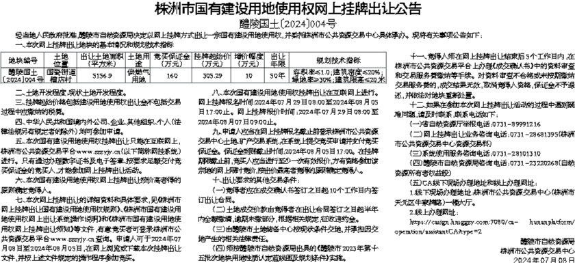 株洲市国有建设用地使用权网上挂牌出让公告